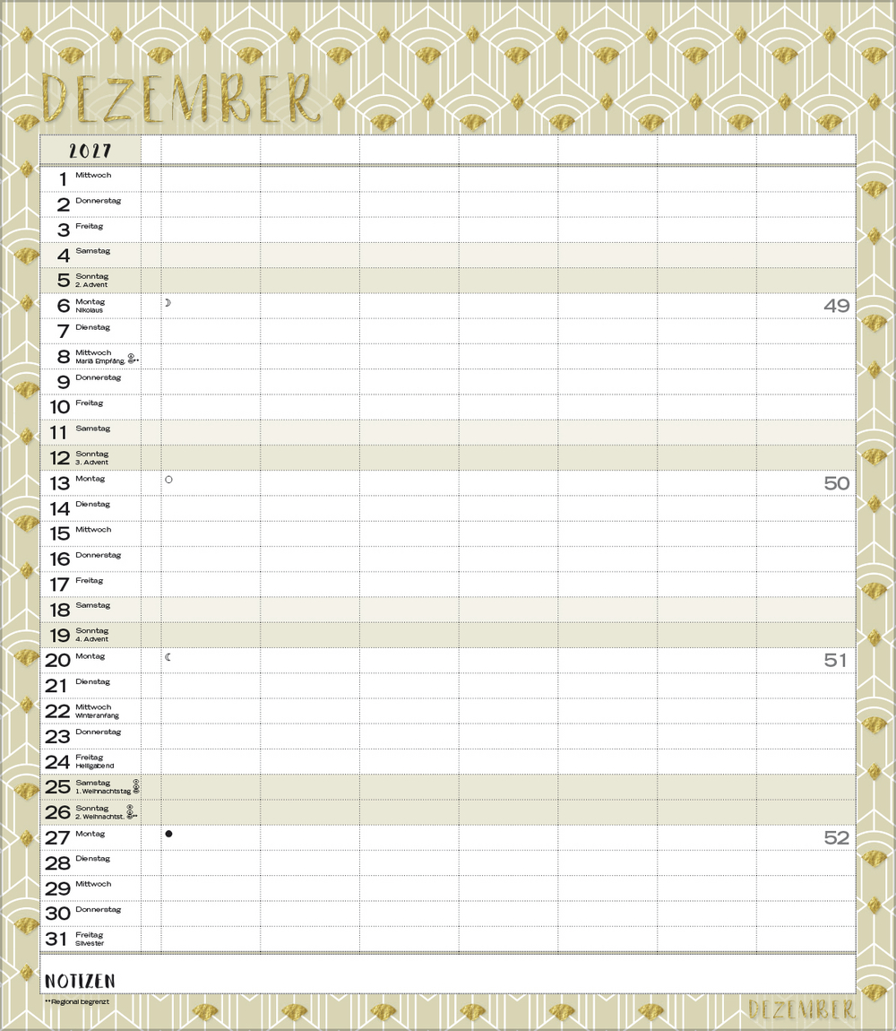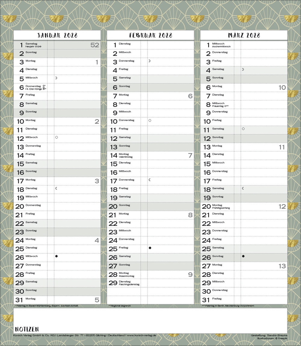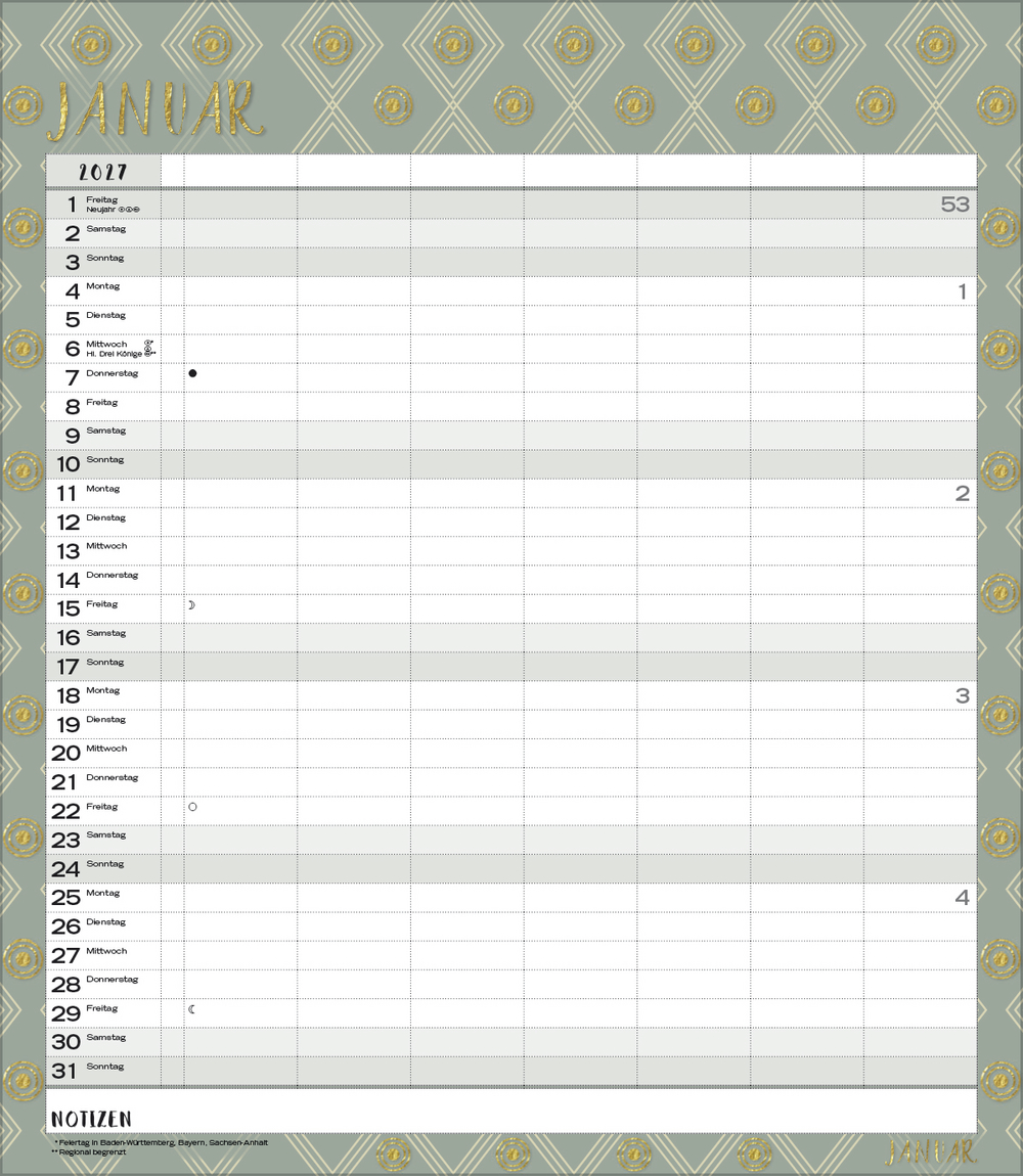 Weitere Informationen wie Mondphasen, Ferientermine und Feiertage (auch regionale) sowie deutlich lesbare Kalenderwochen runden den Kalender ab und sorgen für einen vollständigen Überblick Ihres Jahres.