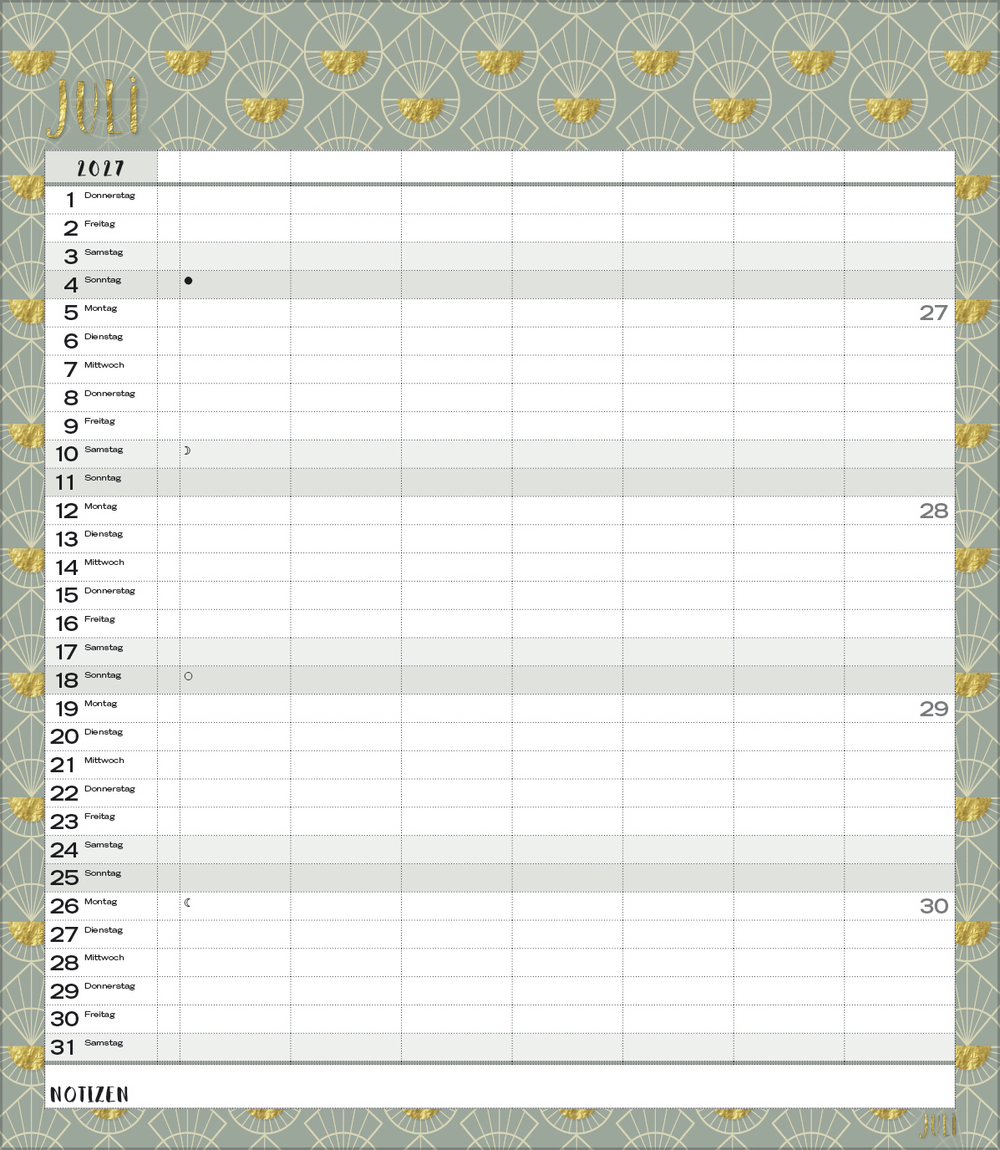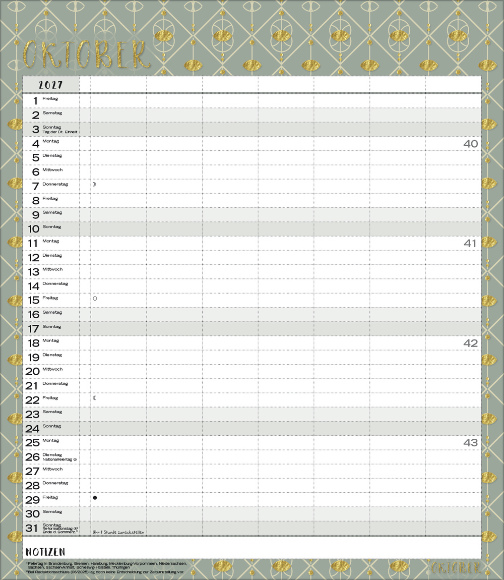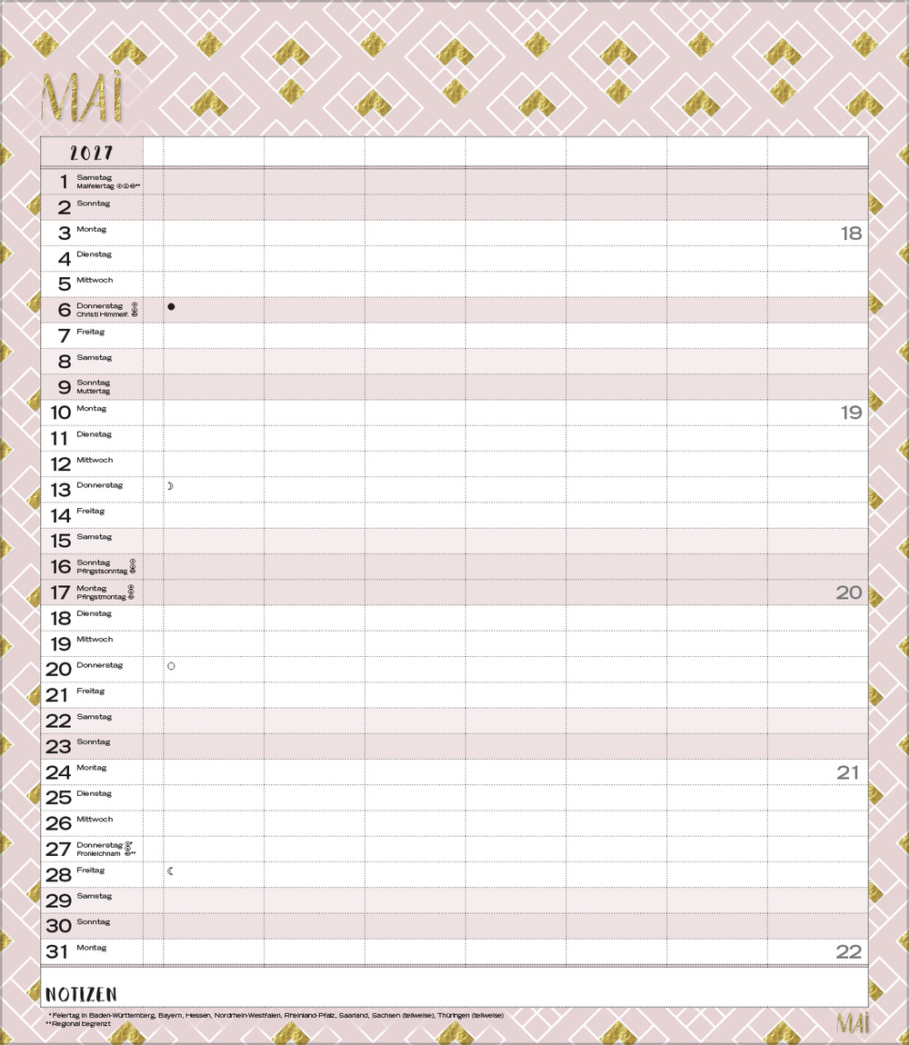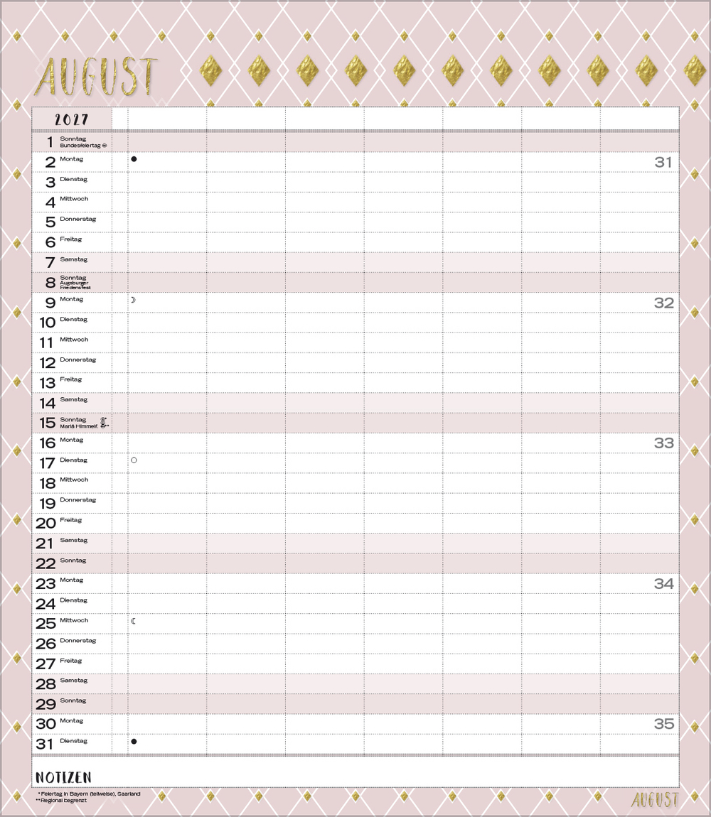 Weitere Informationen wie Mondphasen, Ferientermine und Feiertage (auch regionale) sowie deutlich lesbare Kalenderwochen runden den Kalender ab und sorgen für einen vollständigen Überblick Ihres Jahres.