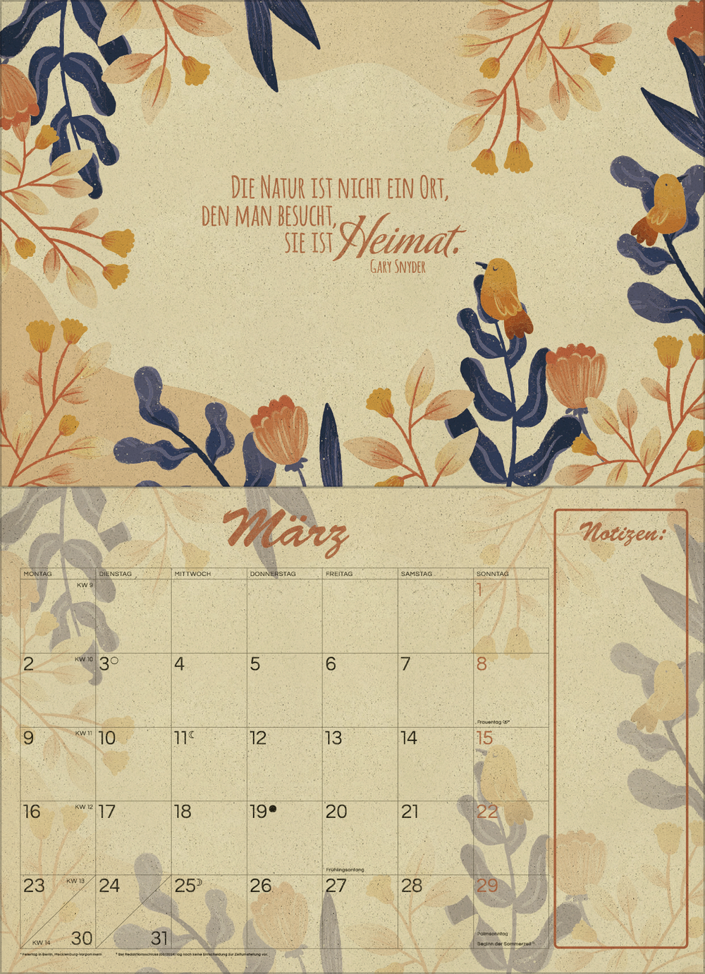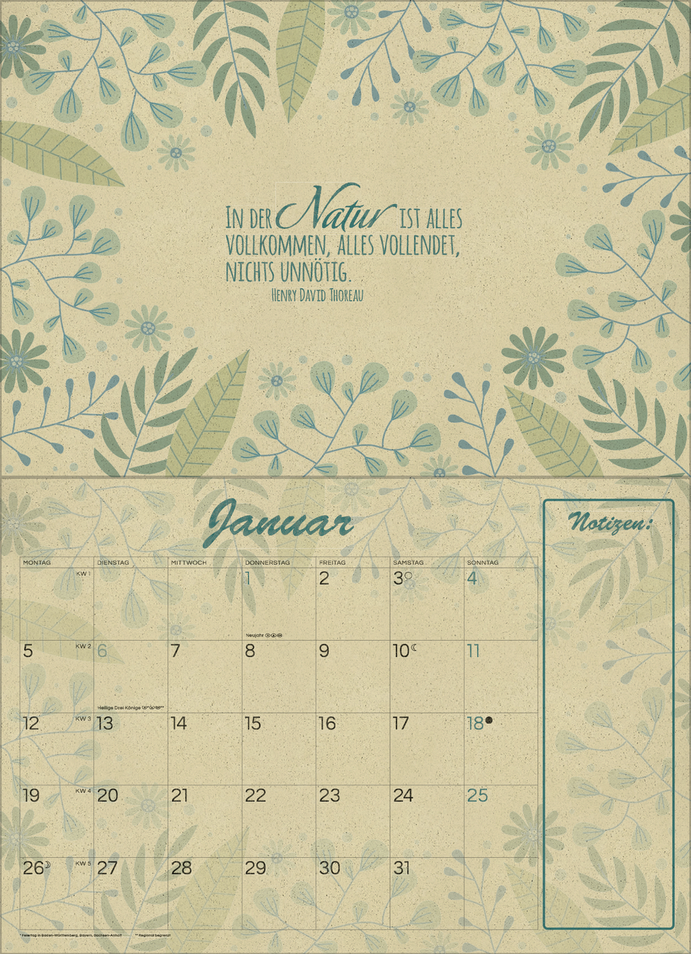 - Jede Kalenderseite mit großem Bild und viel Platz im Kalendarium für Notizen und Termine