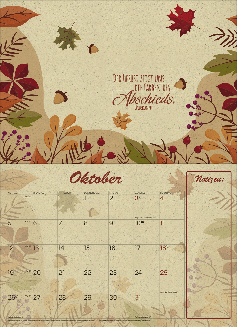 - Wandkalender im Format: 30 x 30 cm; Offenes Format: 30 x 60 cm; umweltfreundliches FSC Papier