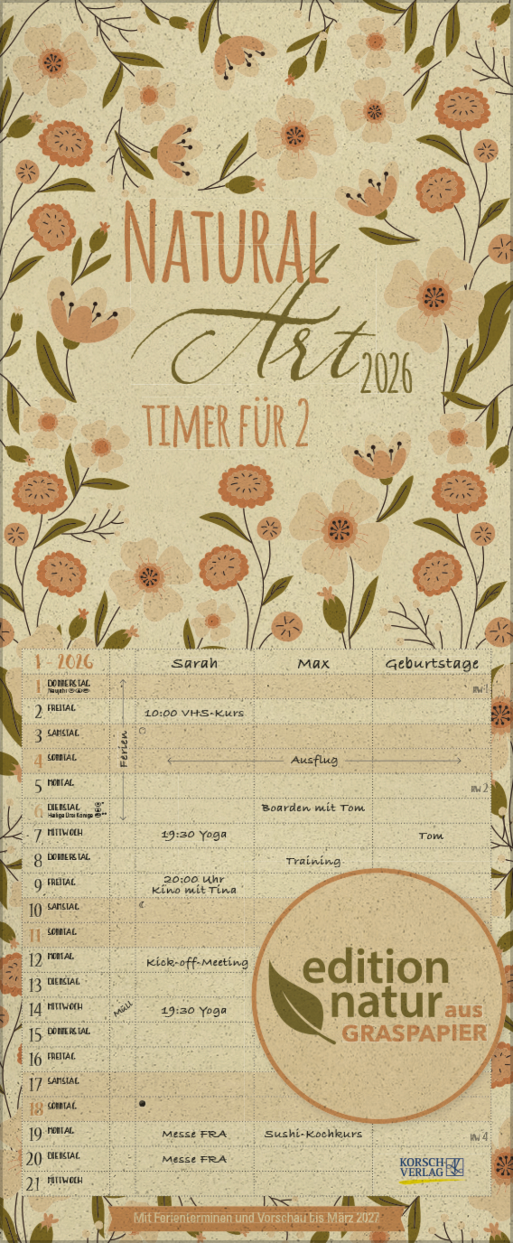 Der Natur zuliebe aus Graspapier – dieser plastikfreie Timer für zwei besticht durch sein naturverbundenes Design, er ist besonders umweltfreundlich und besteht komplett aus Grasfaserpapier. Perfekte Planung für zwei mit drei Spalten plus Müllspalte, Ferienterminen und Vorschau bis März des Folgejahres.