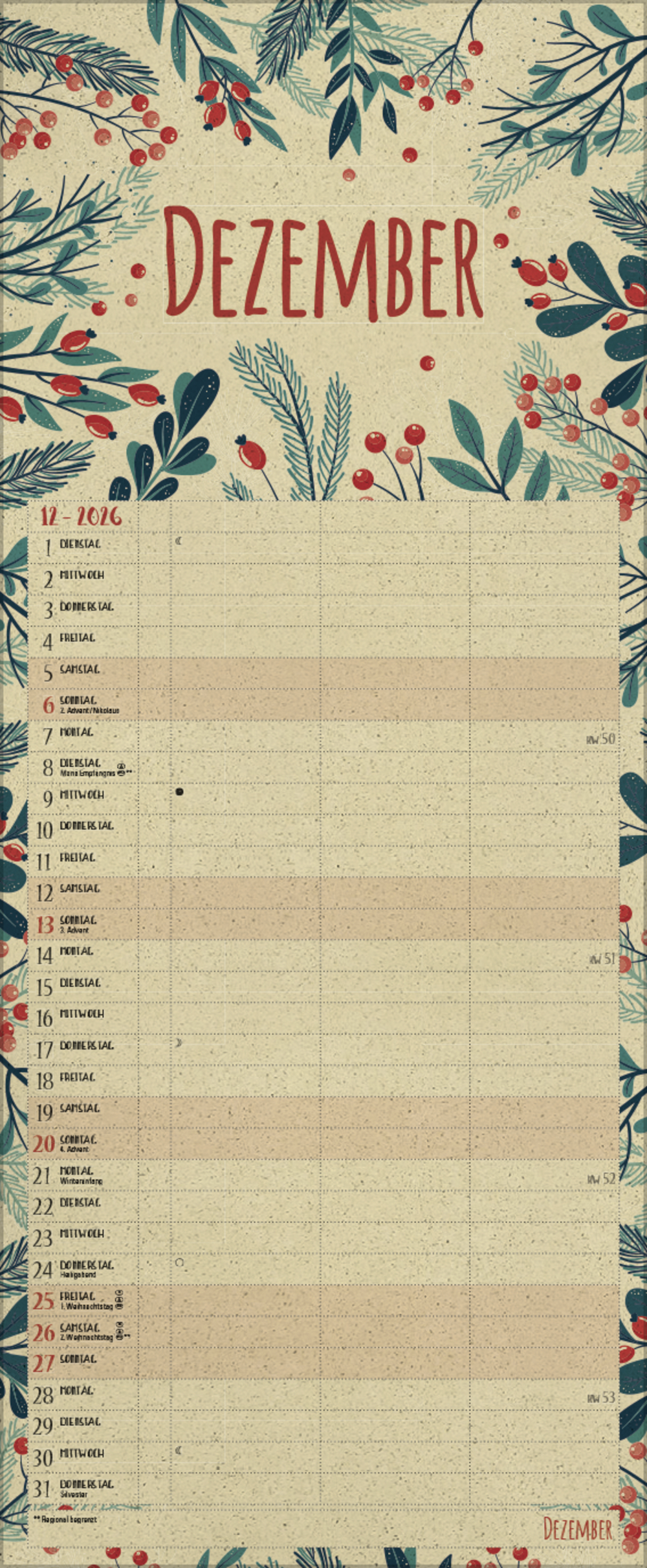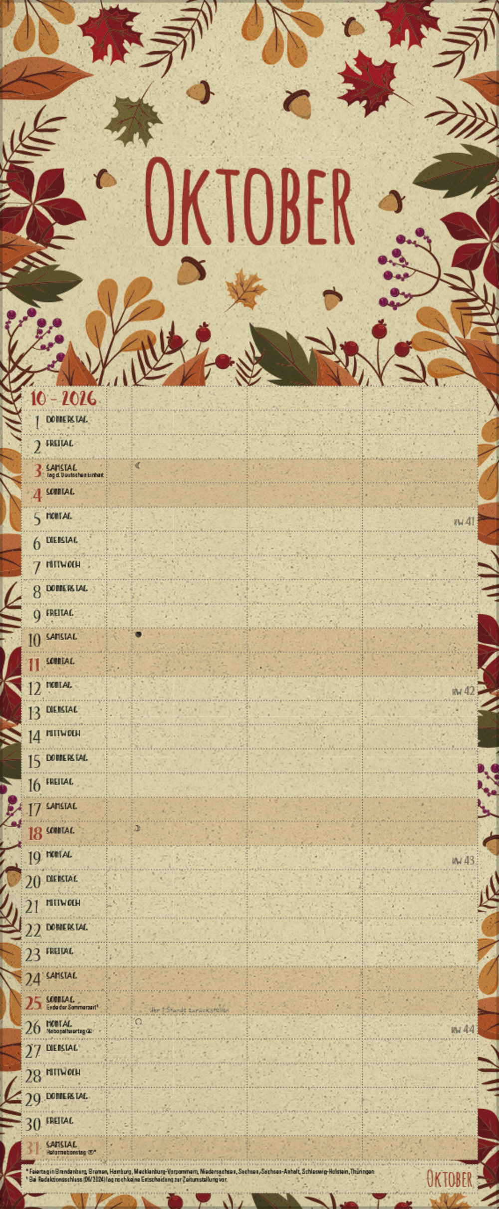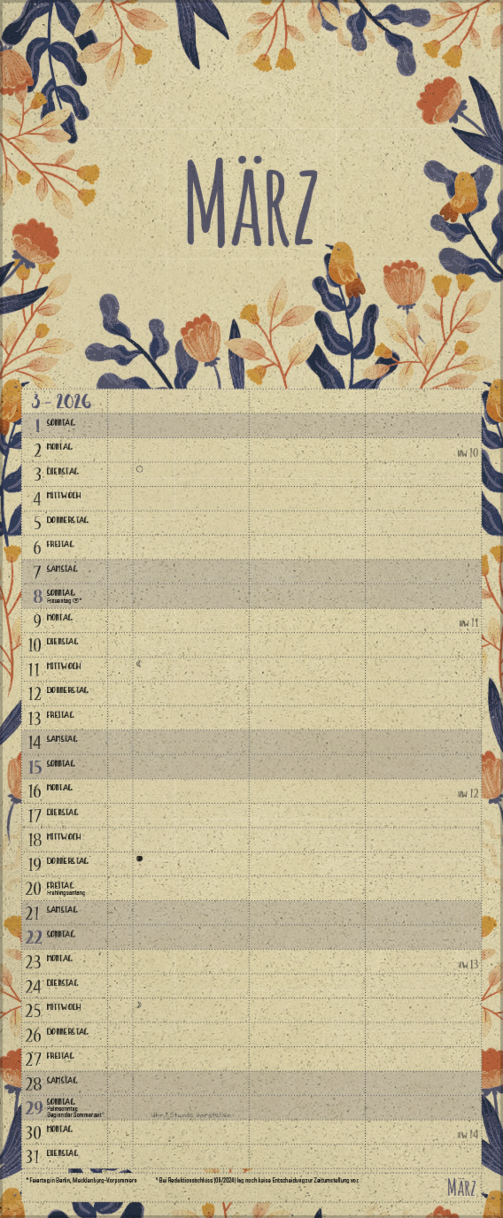 - Farblich hervorgehobene Sonn- und Feiertage, sowie Anzeige der Zeitumstellung