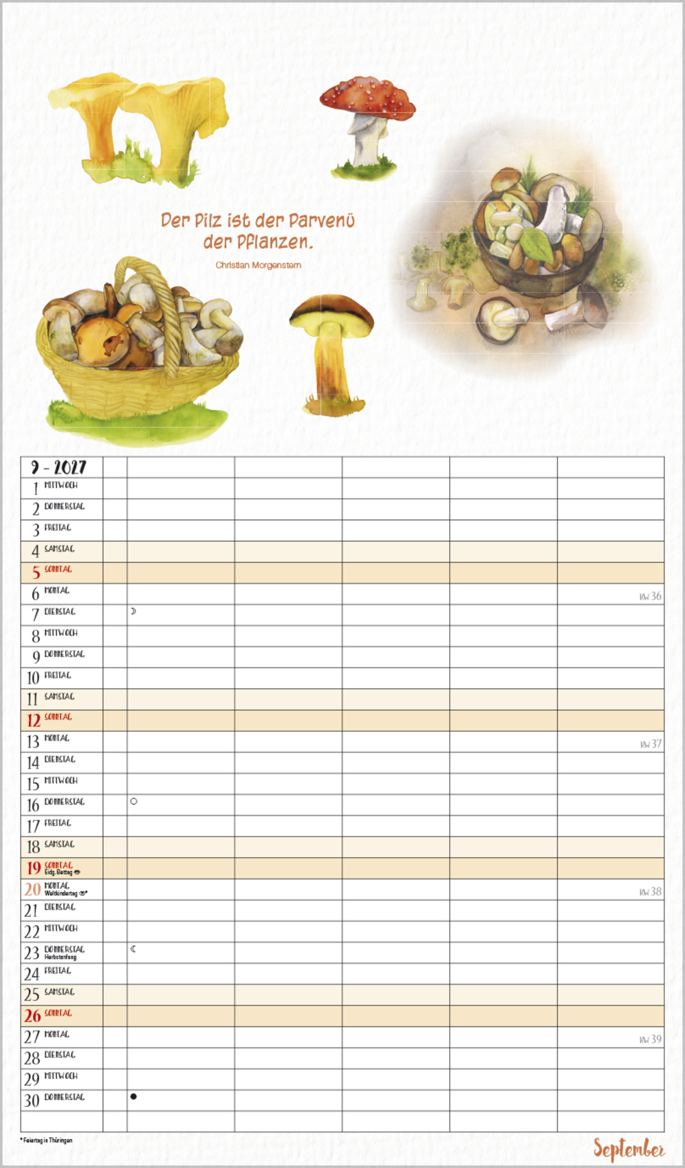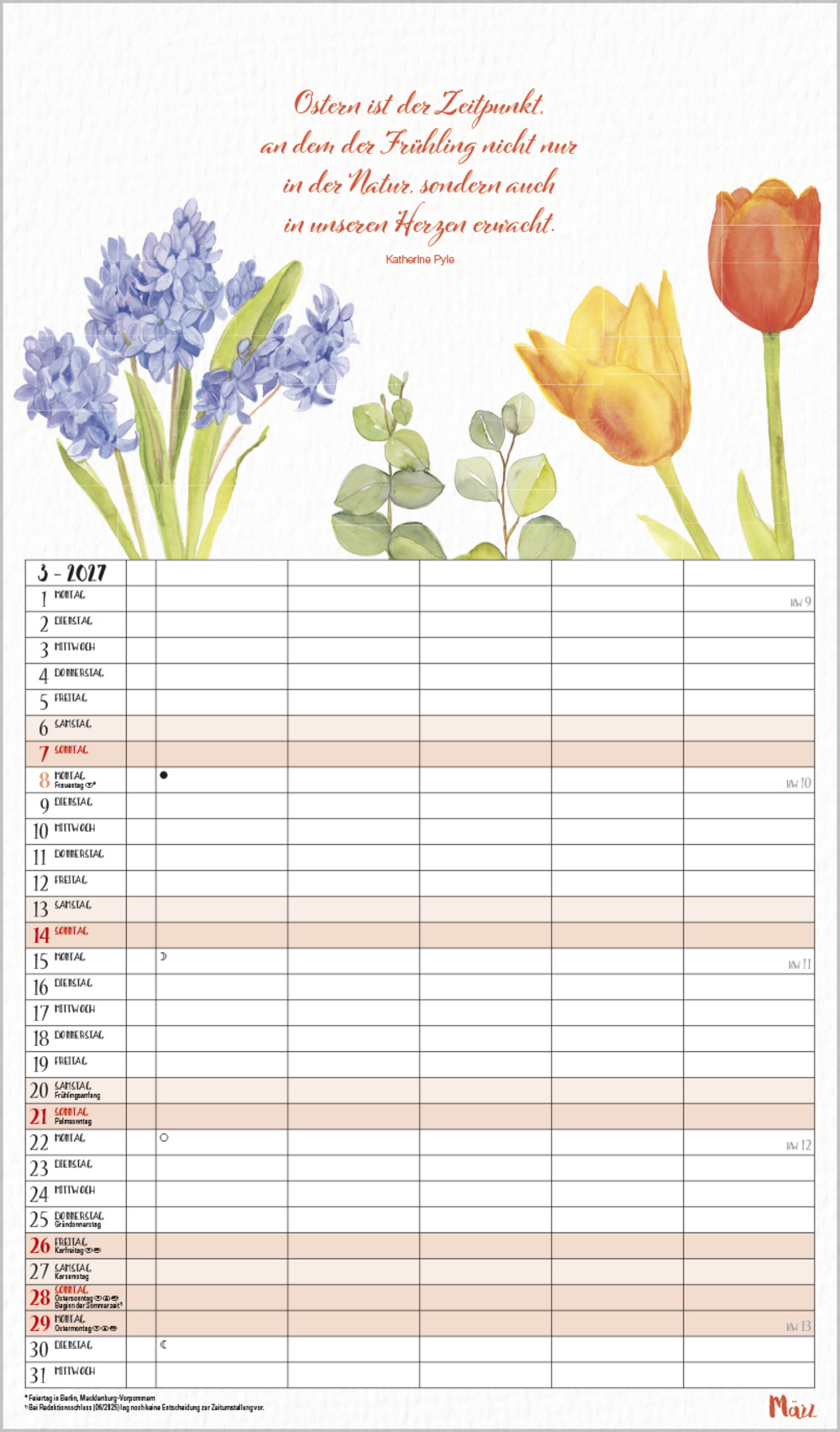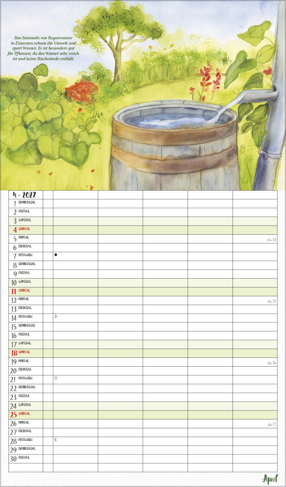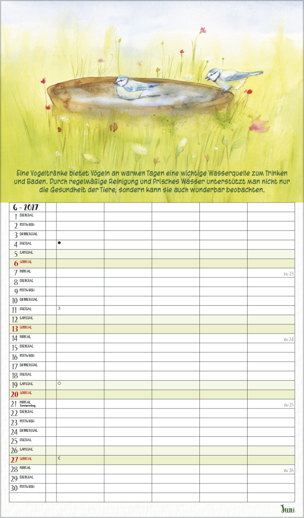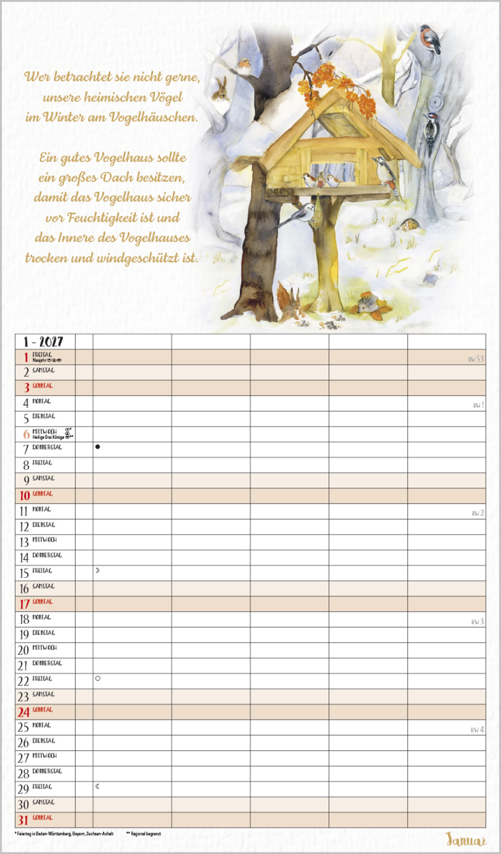 Dieser liebevoll von Petra Lefin gestaltete Kalender im Aquarellstil zeigt jeden Monat fr öhliche Motive aus der Natur mit Zitaten, Infos und Tipps. Mit 5 Spalten, extra Müllspalte sowie Ferienterminen und Vorschau bis März des Folgejahres.