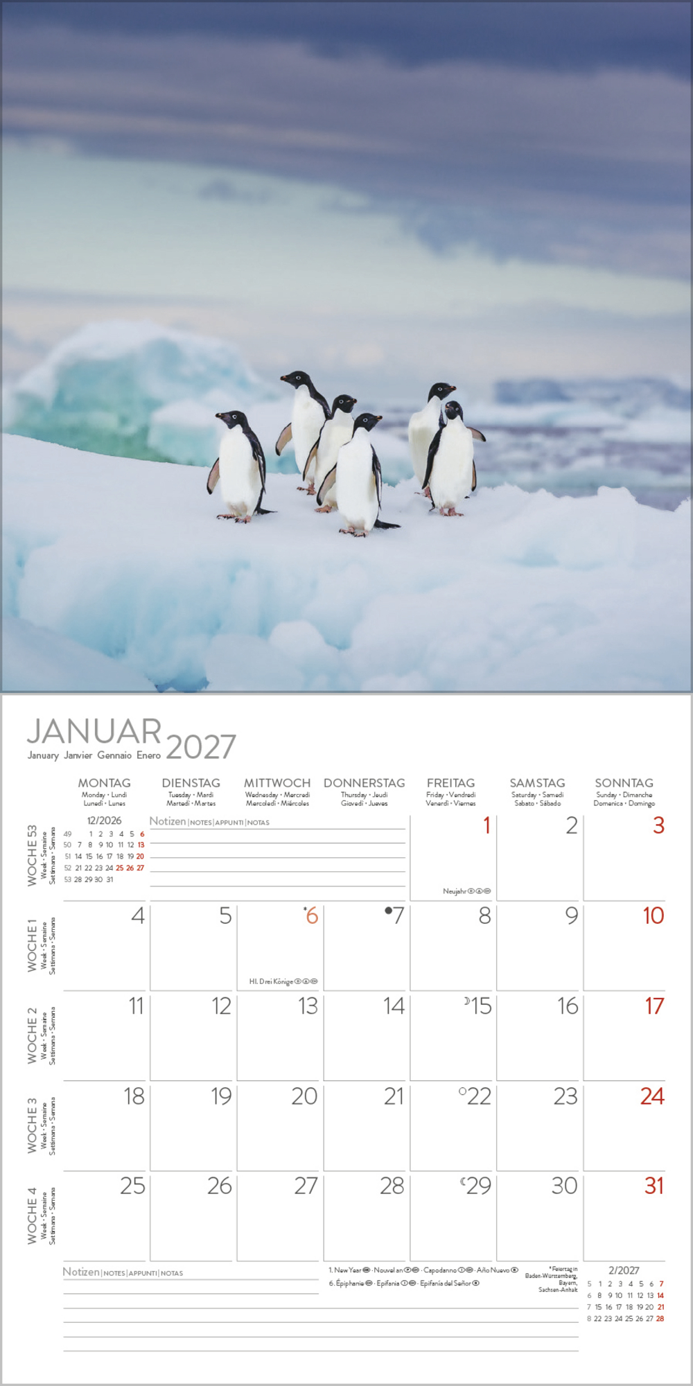 - Jede Kalenderseite mit großem Bild und viel Platz im Kalendarium für Notizen und Termine