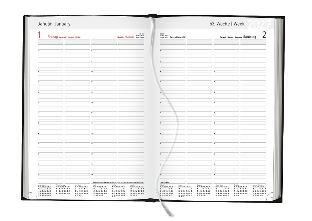 Hochwertiger Buchkalender. Hardcover schwarz. 400 Seiten. Pro Wochentag 1 Seite. Kalendarium d-e-f-i.