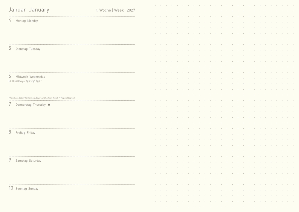 - Jede Doppelseite des 12 Monats-Kalendariums zeigt die Wochenübersicht sowie eine Seite für Notizen