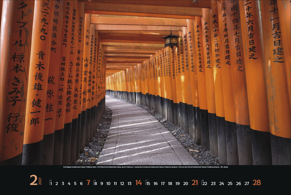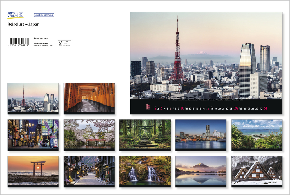 Der Kalender Reiselust Japan nimmt den Betrachter mit auf eine visuelle Reise durch das Land der aufgehenden Sonne. Stimmungsvolle Fotografien zeigen die Vielfalt Japans – von traditionellen Tempeln und Zen-Gärten bis hin zu pulsierenden Metropolen und atemberaubenden Landschaften. Ein perfekter Jahresbegleiter für alle, die Japan lieben, entdecken wollen oder einfach von fernöstlicher Schönheit träumen.