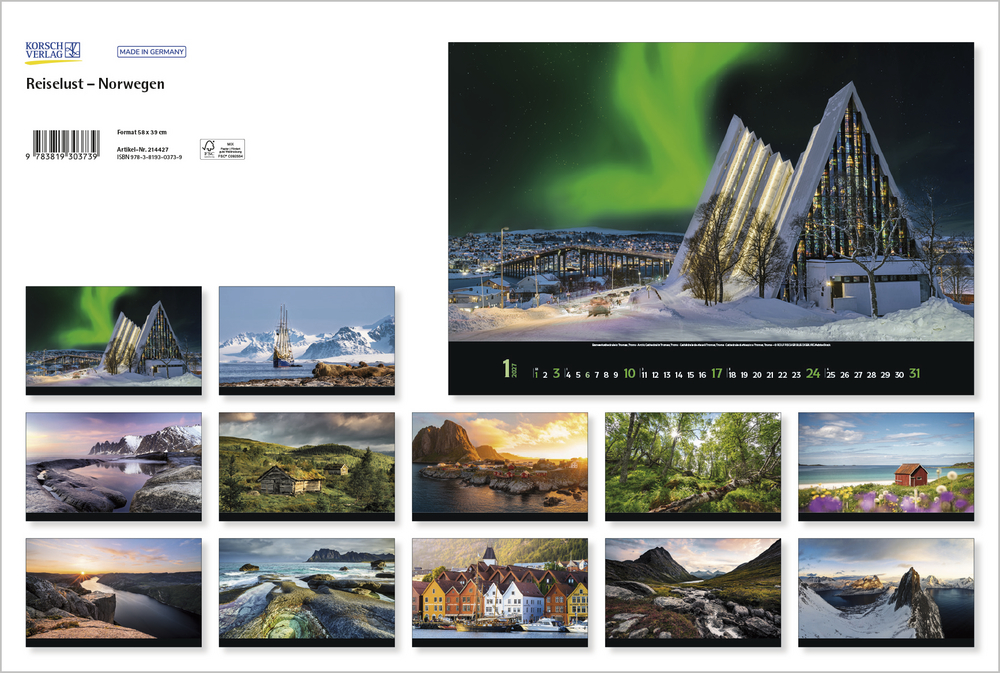 Der Kalender Reiselust Norwegen präsentiert atemberaubende Fotografien, die die spektakuläre Natur und malerische Orte Norwegens in all ihren Facetten einfangen – von dramatischen Fjorden über leuchtende Nordlichter bis zu charmanten, abgelegenen Dörfern. Ein visueller Genuss für alle, die die beeindruckende Schönheit Norwegens entdecken möchten.