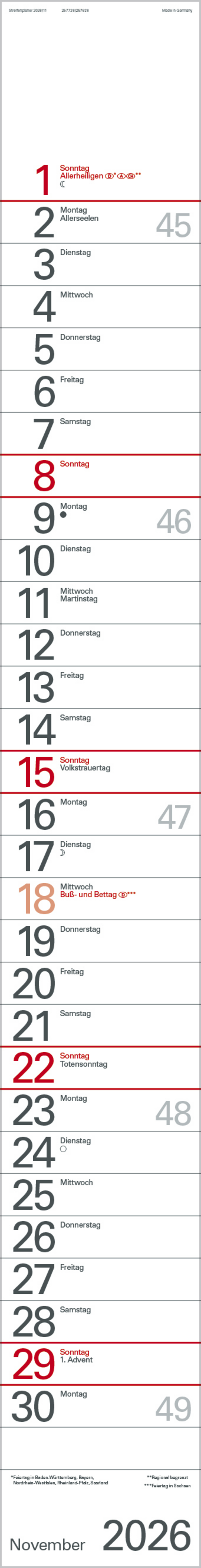 Praktischer Streifenplaner. Abreißkalender. Sonn- und Feiertage in Rot. Kalendarium in deutscher Sprache.