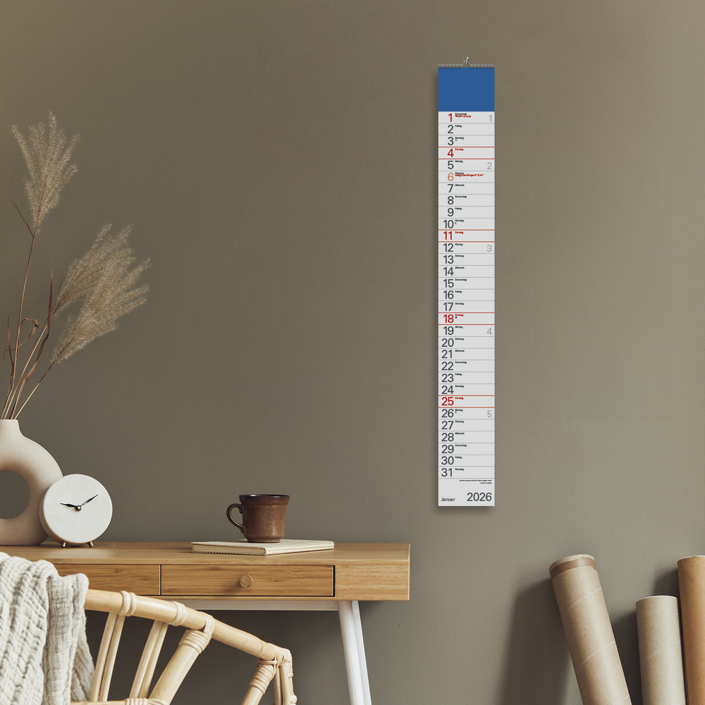 • Format: 11,4 x 89 cm; schmaler Wandkalender mit viel Platz für Termine und Datumsschieber