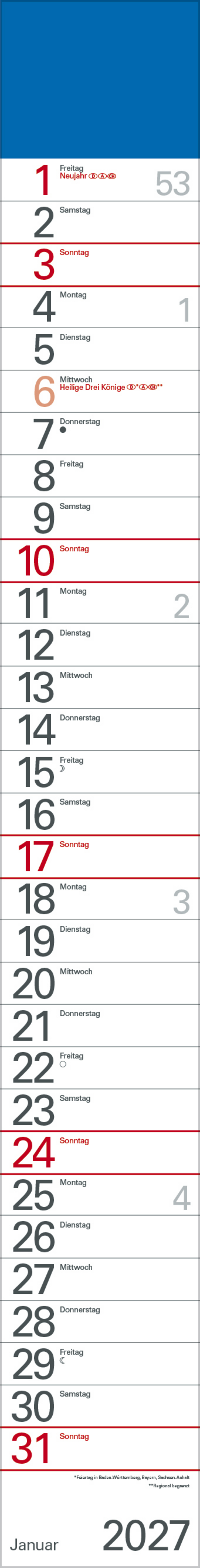 Praktischer Streifenplaner. Abreißkalender. Sonn- und Feiertage in Rot. Kalendarium in deutscher Sprache.