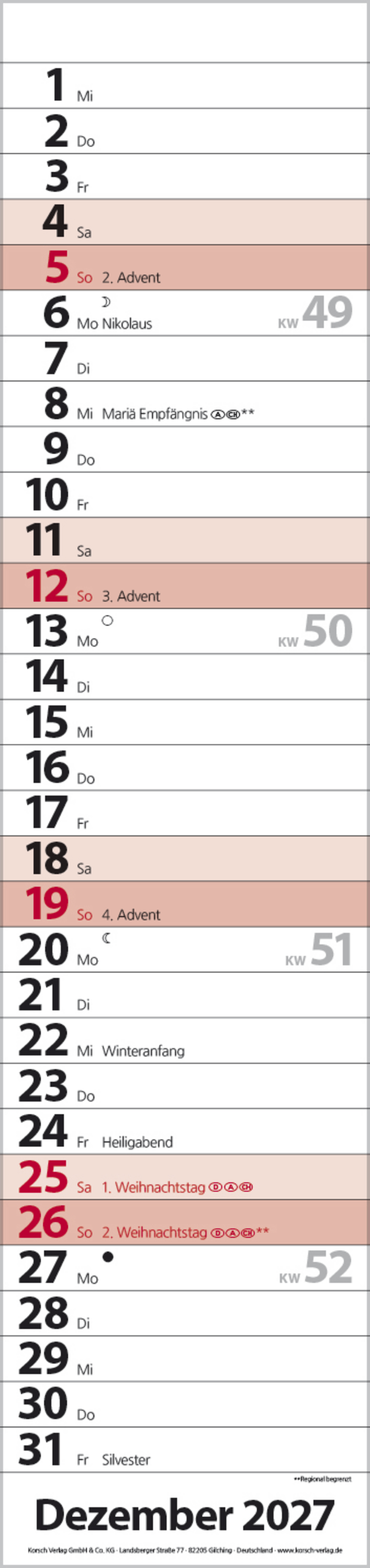 • Kalendarium auf Deutsch mit hervorgehobenen Sonn- und Feiertagen für D, A und CH
