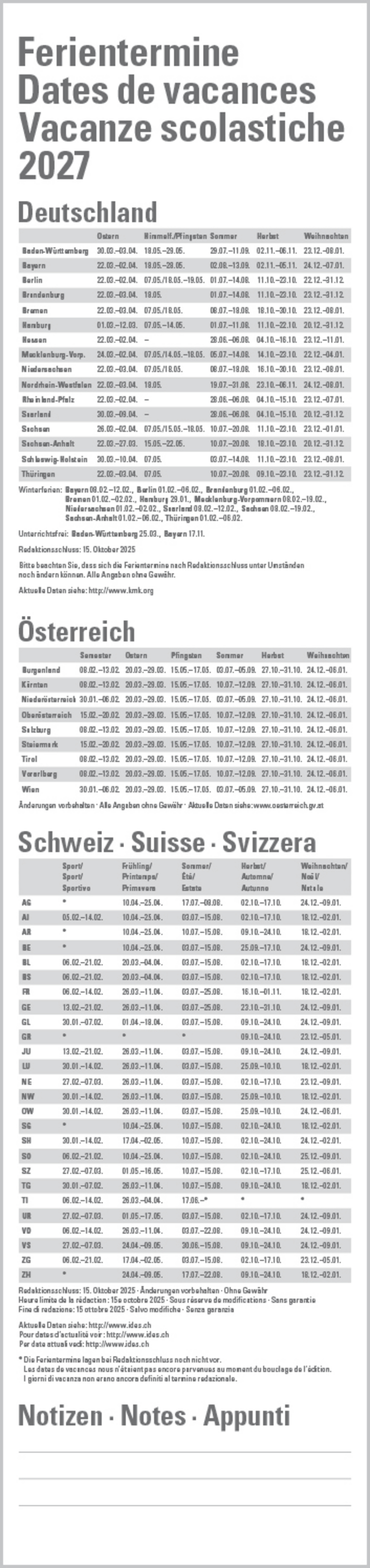 Attraktiver Streifenplaner in kompaktem Format mit Spiralbindung und Feiertagen für D/A/CH. Sonn- und Feiertage in Rot. Kalendarium in deutscher Sprache.