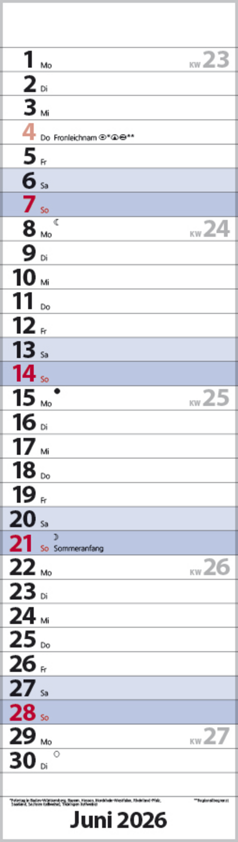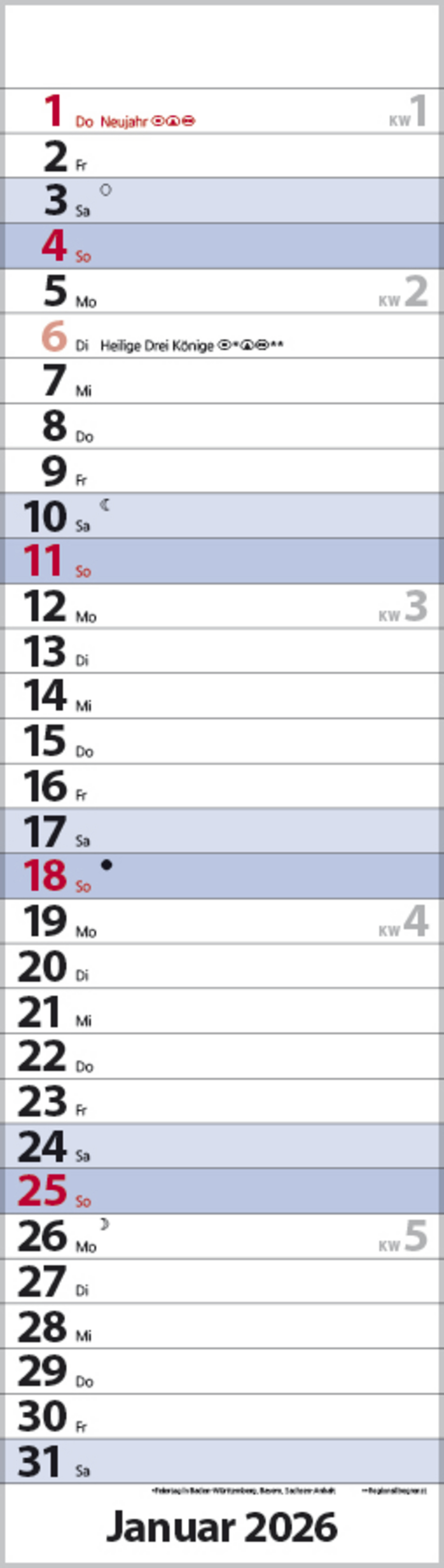Attraktiver Streifenplaner in kleinen Format mit Spiralbindung und Feiertagen für D/A/CH. Die Wochenenden sind blau hervorgehoben. Kalendarium in deutscher Sprache.