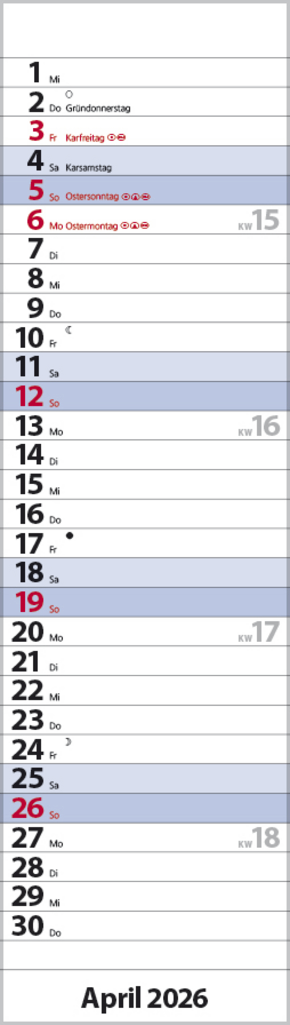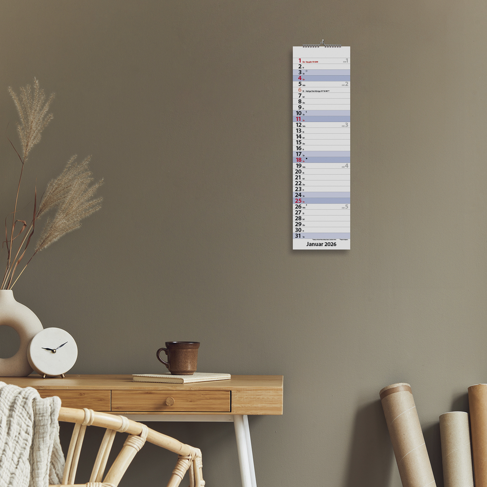 • Format: 8,5 x 30 cm; schmaler Wandkalender mit viel Platz für Termine
