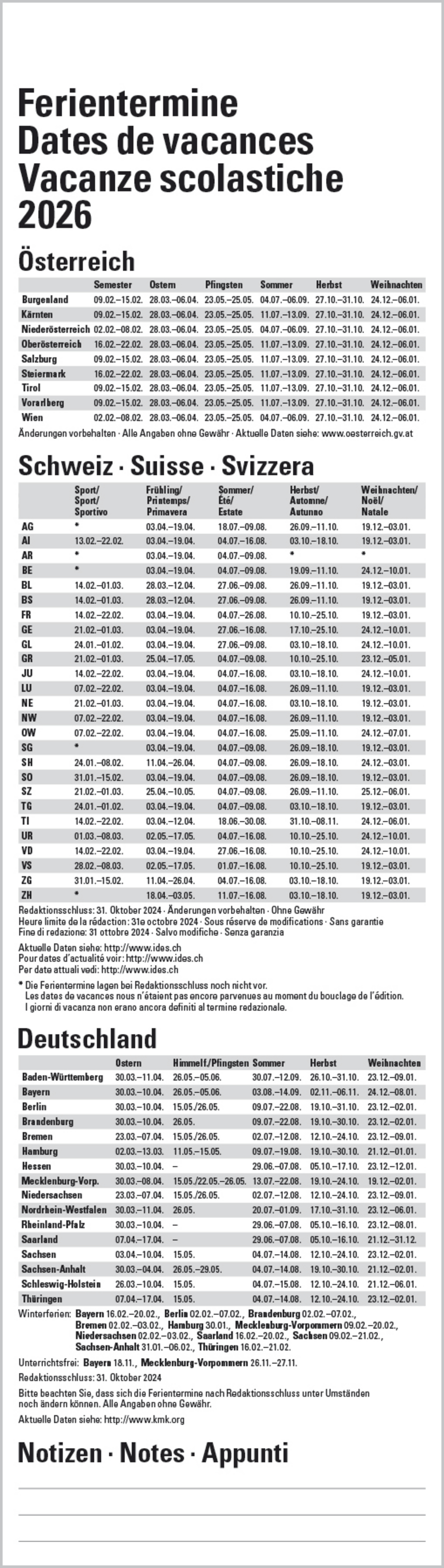 • Kalendarium auf Deutsch mit hervorgehobenen Sonn- und Feiertagen für D, A und CH und Ferienterminen