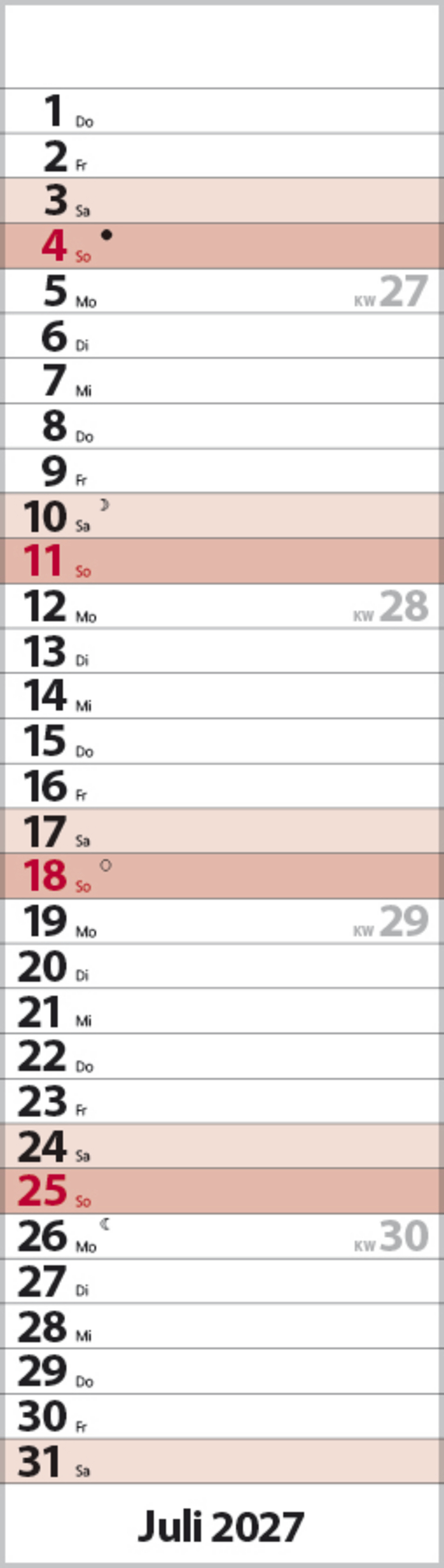 • Format: 8,5 x 30 cm; schmaler Wandkalender mit viel Platz für Termine