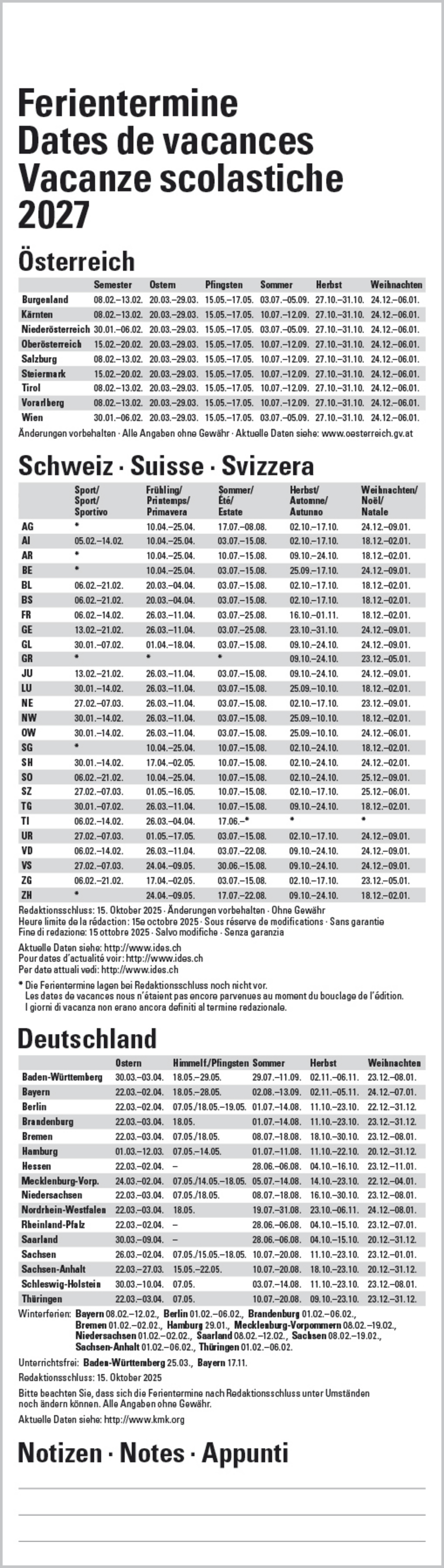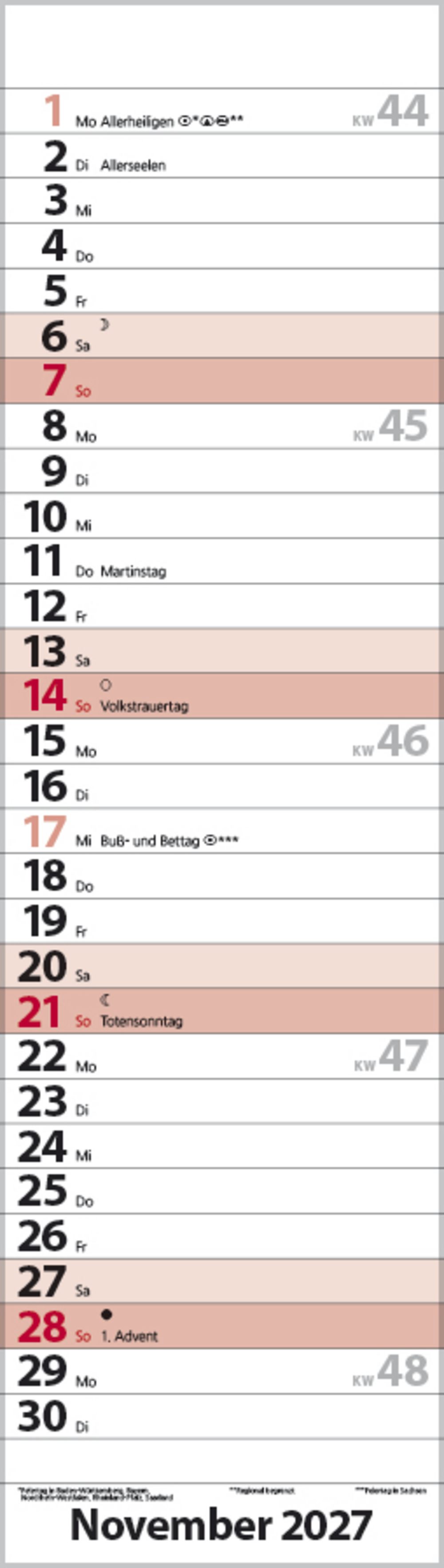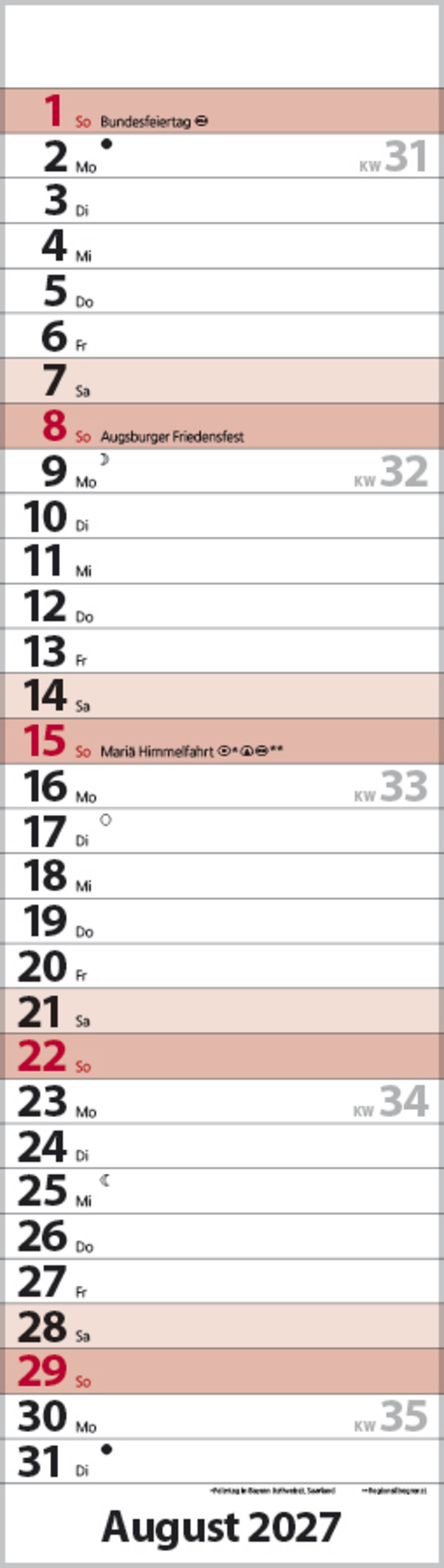 • Kalendarium auf Deutsch mit hervorgehobenen Sonn- und Feiertagen für D, A und CH