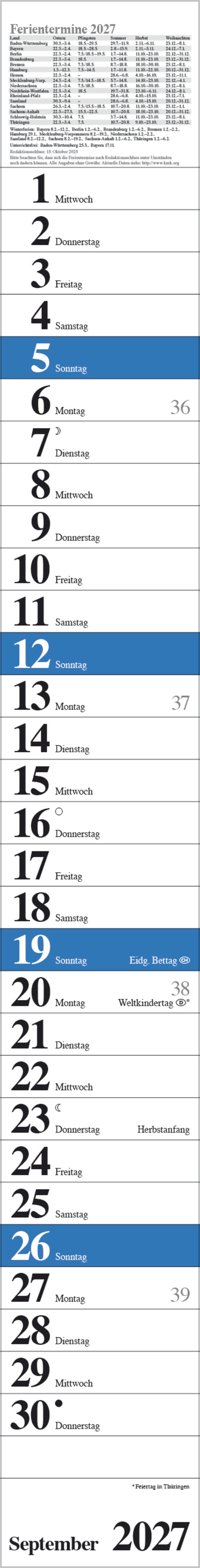 Praktischer Streifenplaner mit Spiralbindung, Datumsschieber und Ferienterminen. Sonntage blau markiert. Kalendarium in deutscher Sprache.