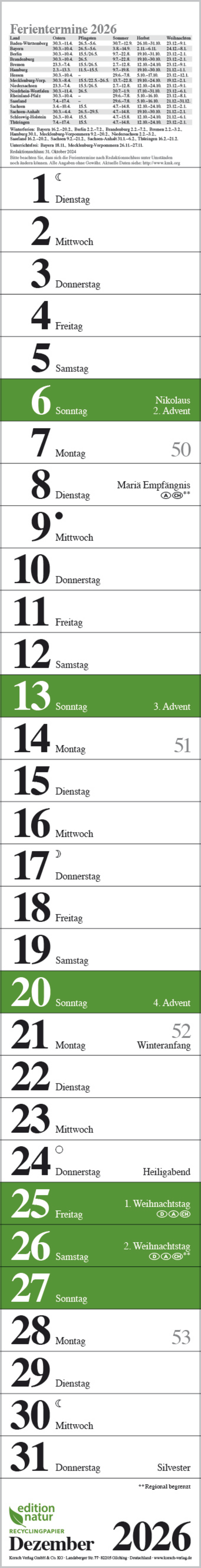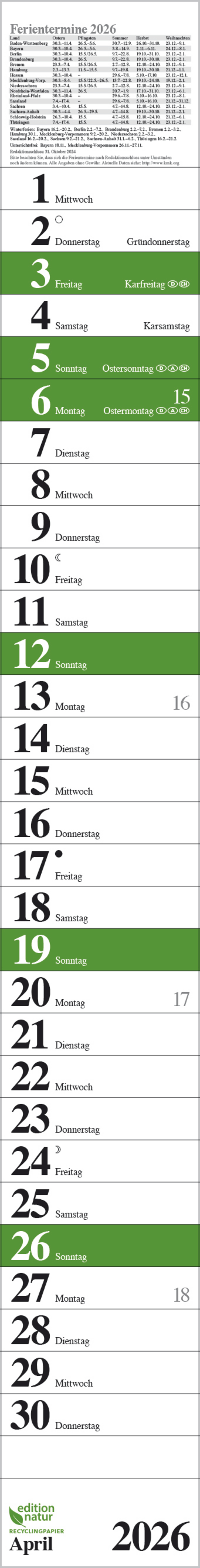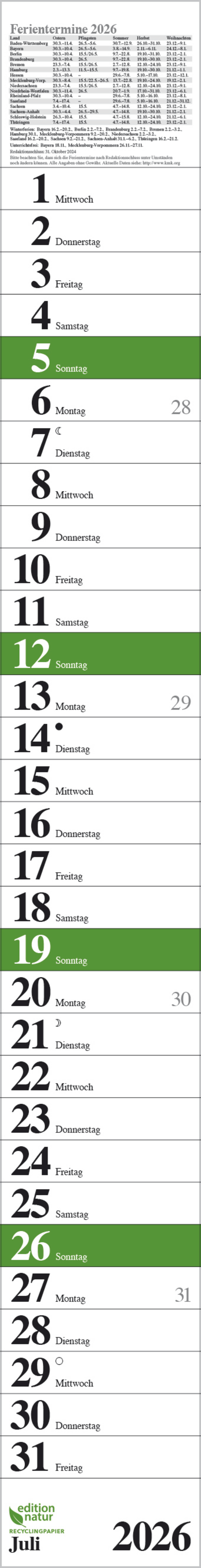 Praktischer Streifenplaner auf Recyclingpapier mit Ferienterminen. Sonntage grün markiert. Kalendarium in deutscher Sprache.