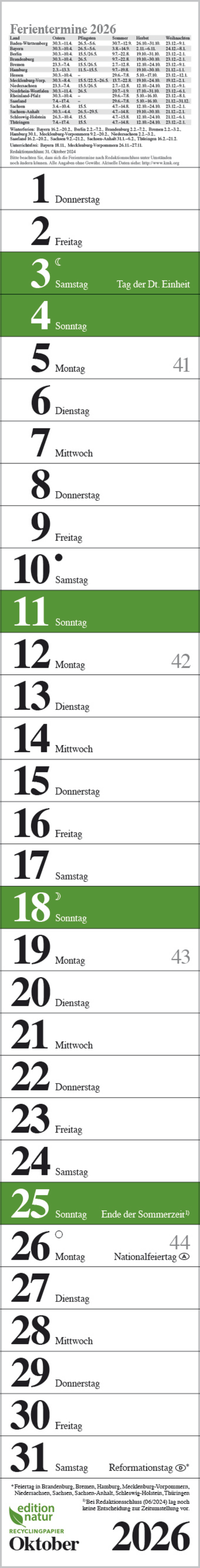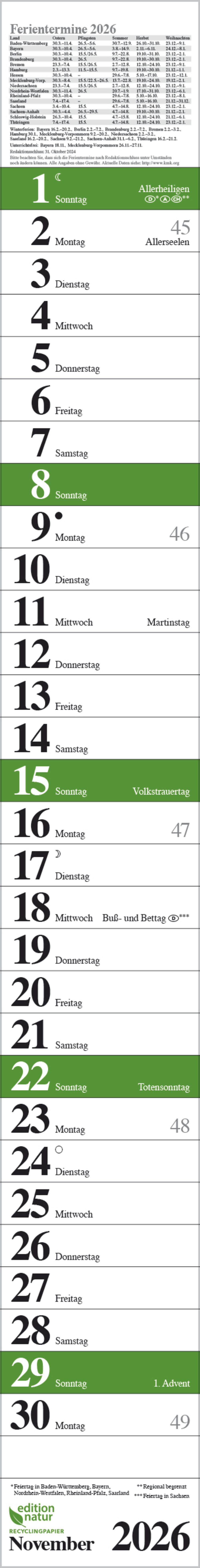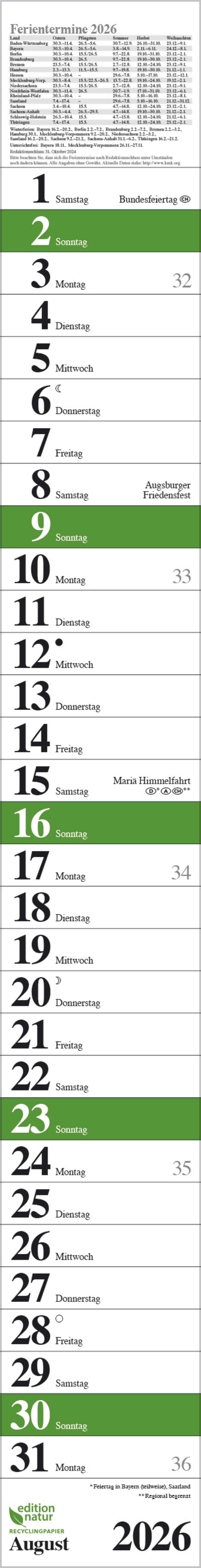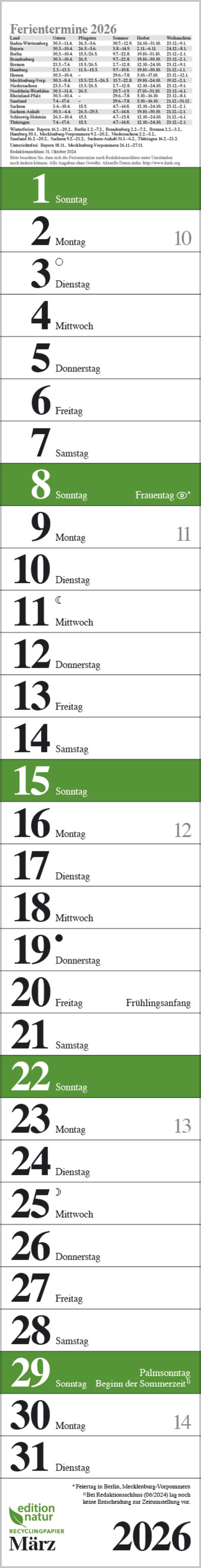 Praktischer Streifenplaner auf Recyclingpapier mit Ferienterminen. Sonntage grün markiert. Kalendarium in deutscher Sprache.