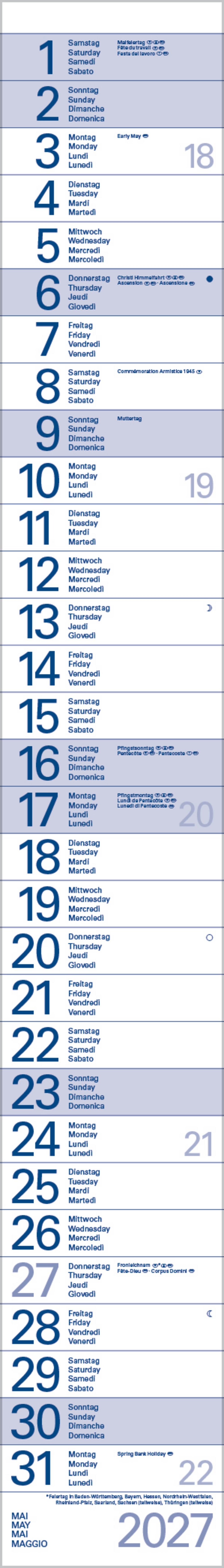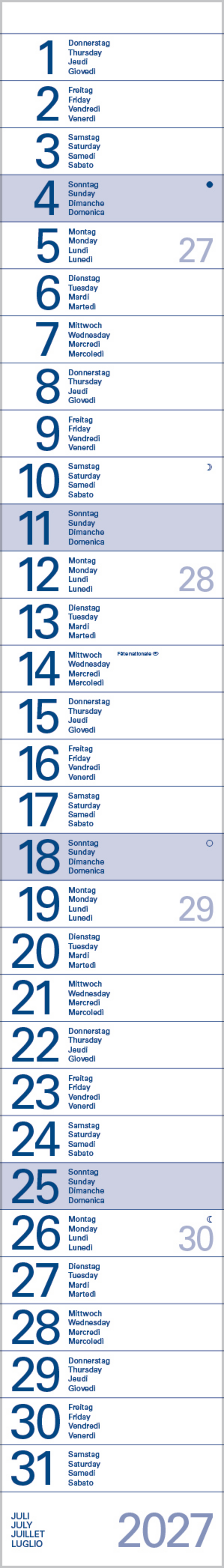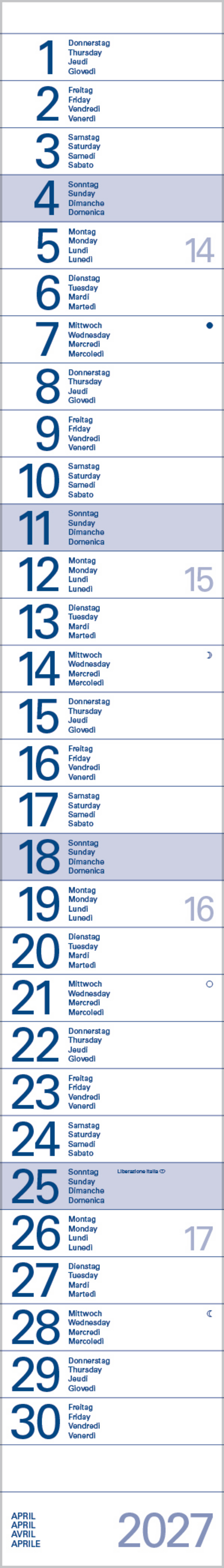• Kalendarium auf Deutsch, Englisch, Französisch und Italienisch mit hervorgehobenen Sonn- und Feiertagen für D, A und CH