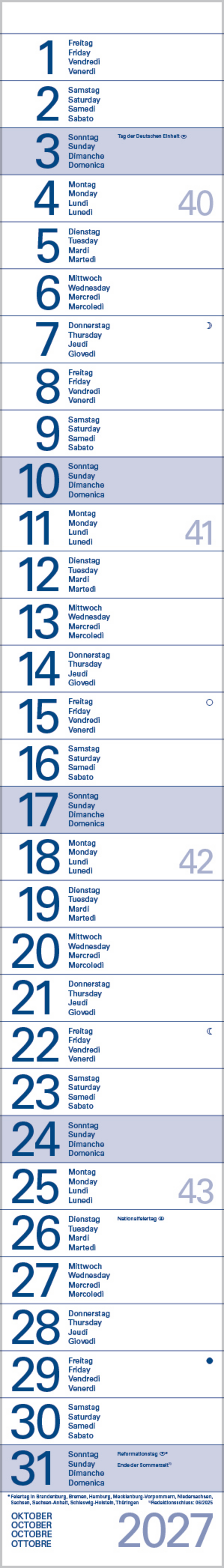 Praktischer Streifentimer mit Spiralbindung und Datumsschieber. Sonn- und Feiertage blau markiert. Kalendarium d-e-f-i.