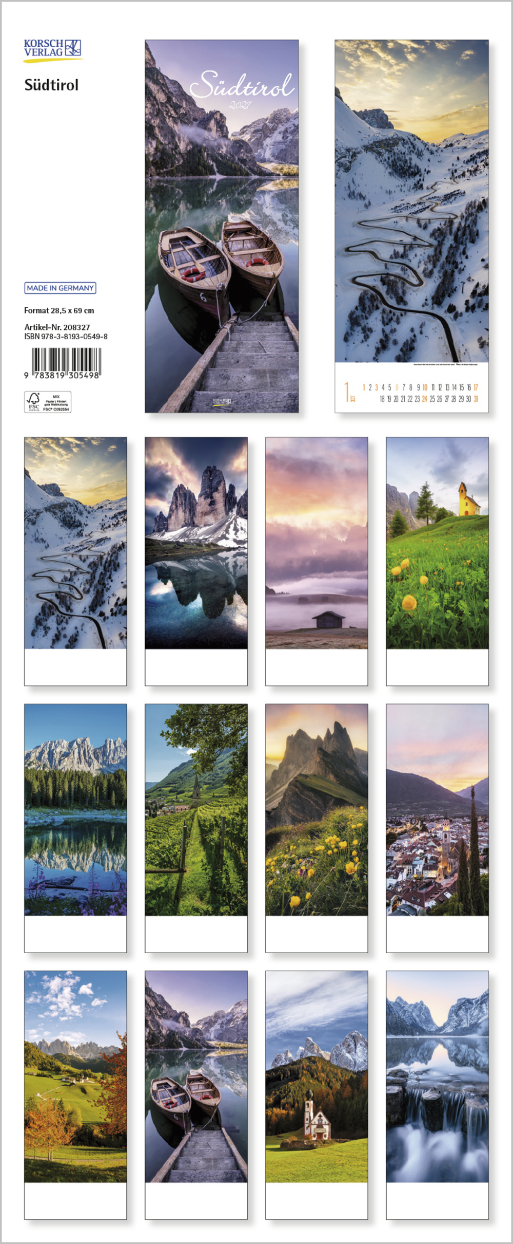 Wildromantische Bergpanoramen, idyllische Orte, typische Kirchlein und malerische Seen mit spektakulären Stimmungen präsentieren die faszinierende Landschaft Südtirols. Durch das extreme Hochformat werden bekannte und beliebte Ansichten in diesem Kalender noch einmal ganz neu in Szene gesetzt.
