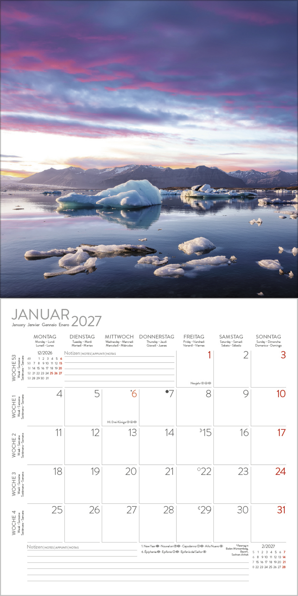 - Jede Kalenderseite mit großem Bild und viel Platz im Kalendarium für Notizen und Termine