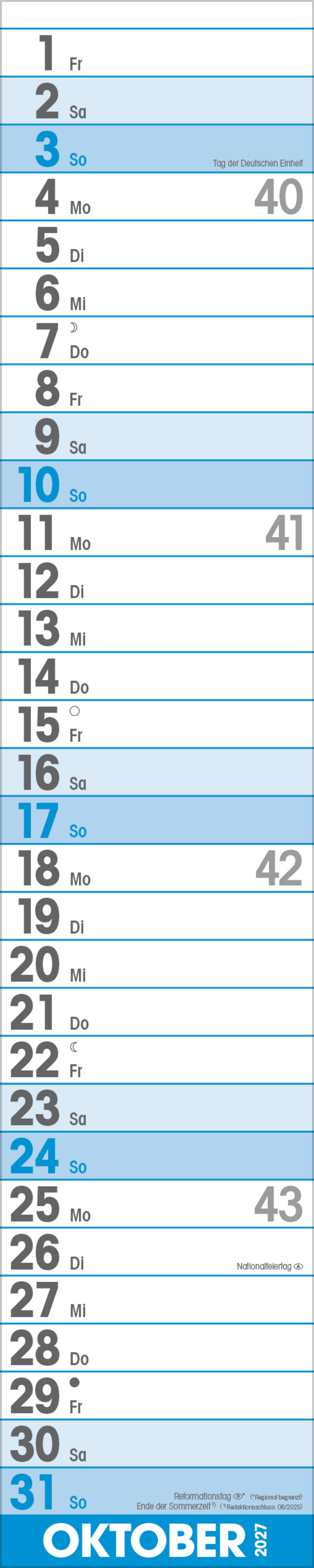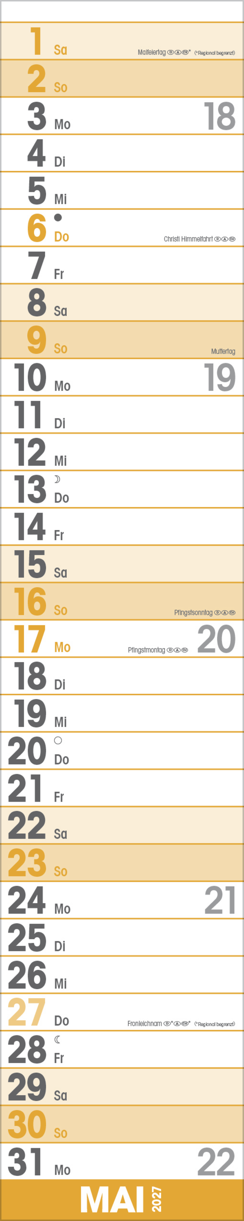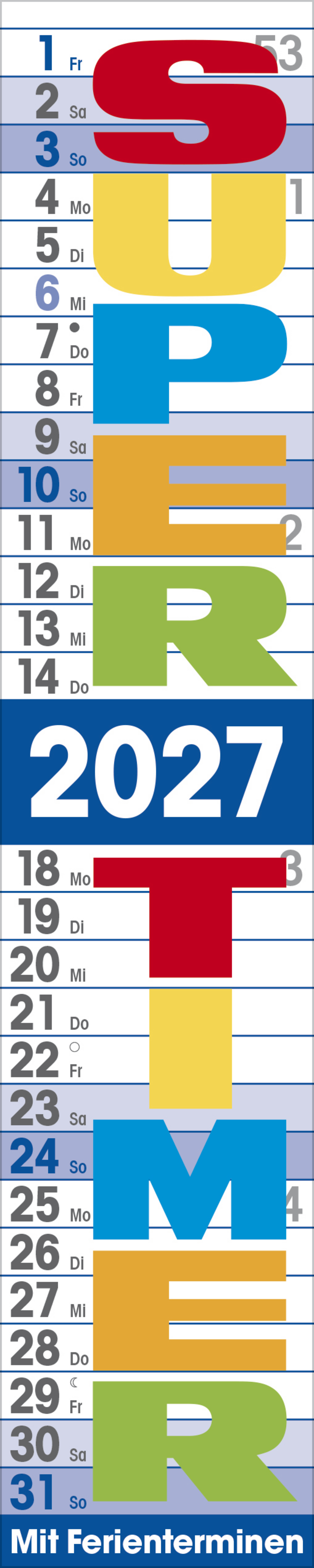 Attraktiver Streifenplaner im Super-Lang-Format. Viel Platz für persönliche Eintragungen. Mit Spiralbindung, Datumsschieber und Ferienterminen. Sonn- und Feiertage farblich markiert. Kalendarium in deutscher Sprache.