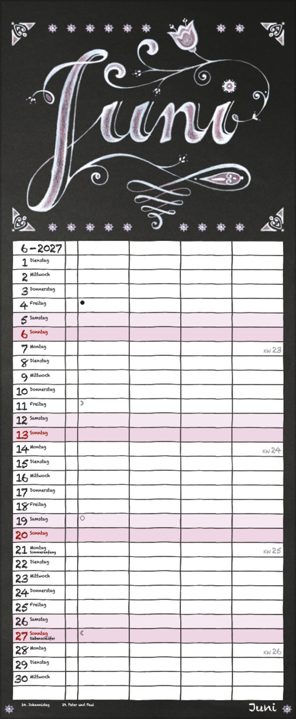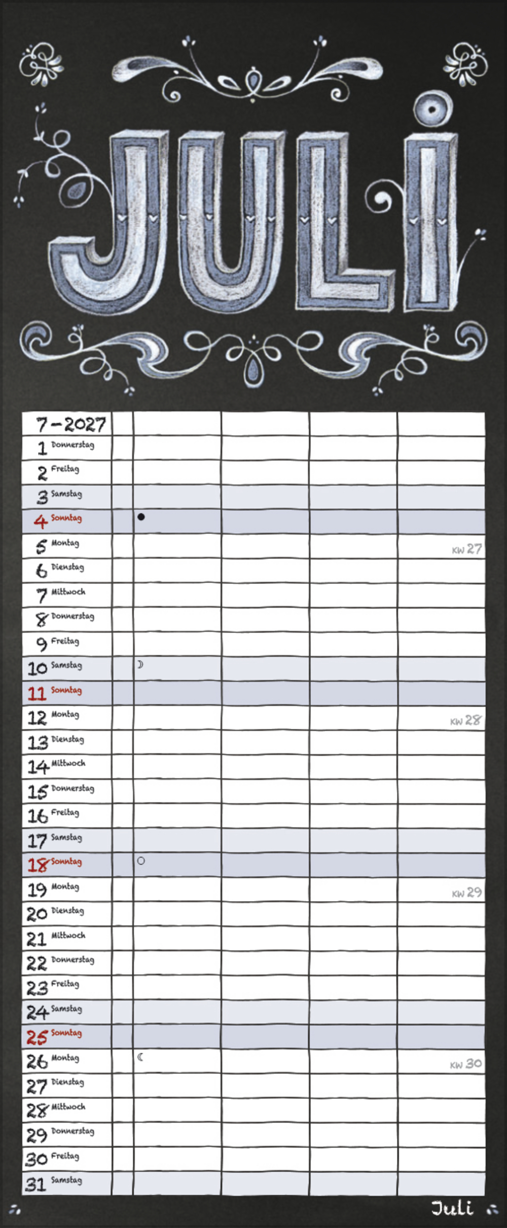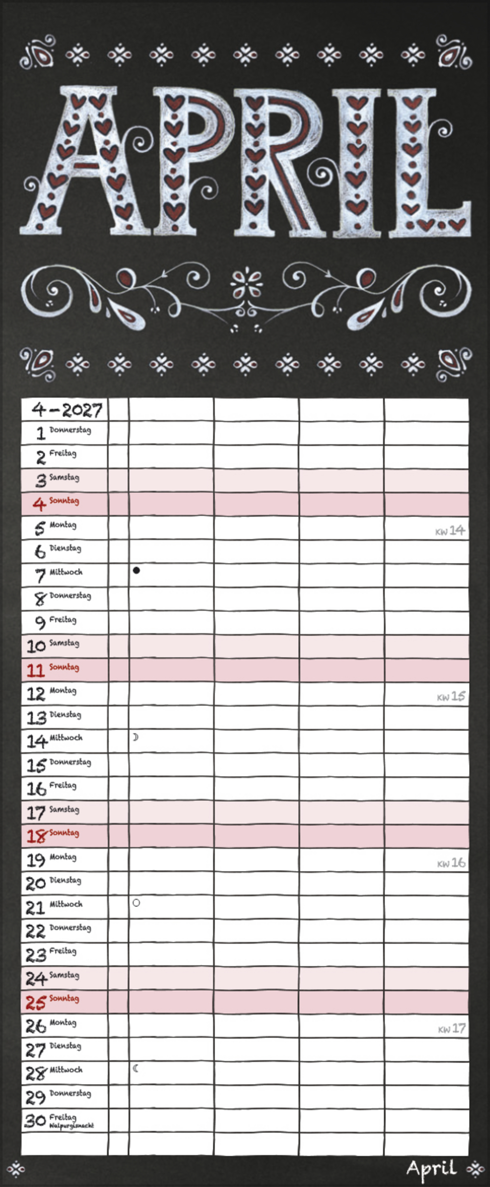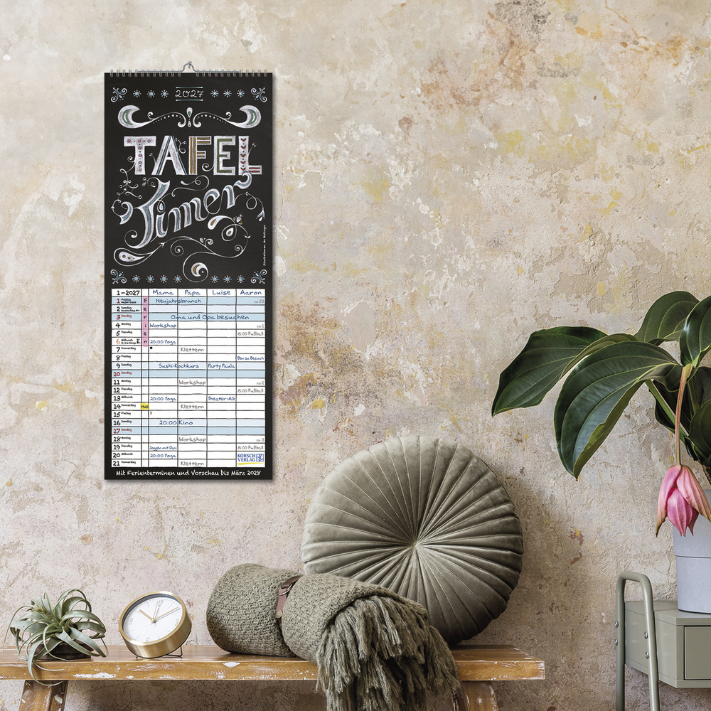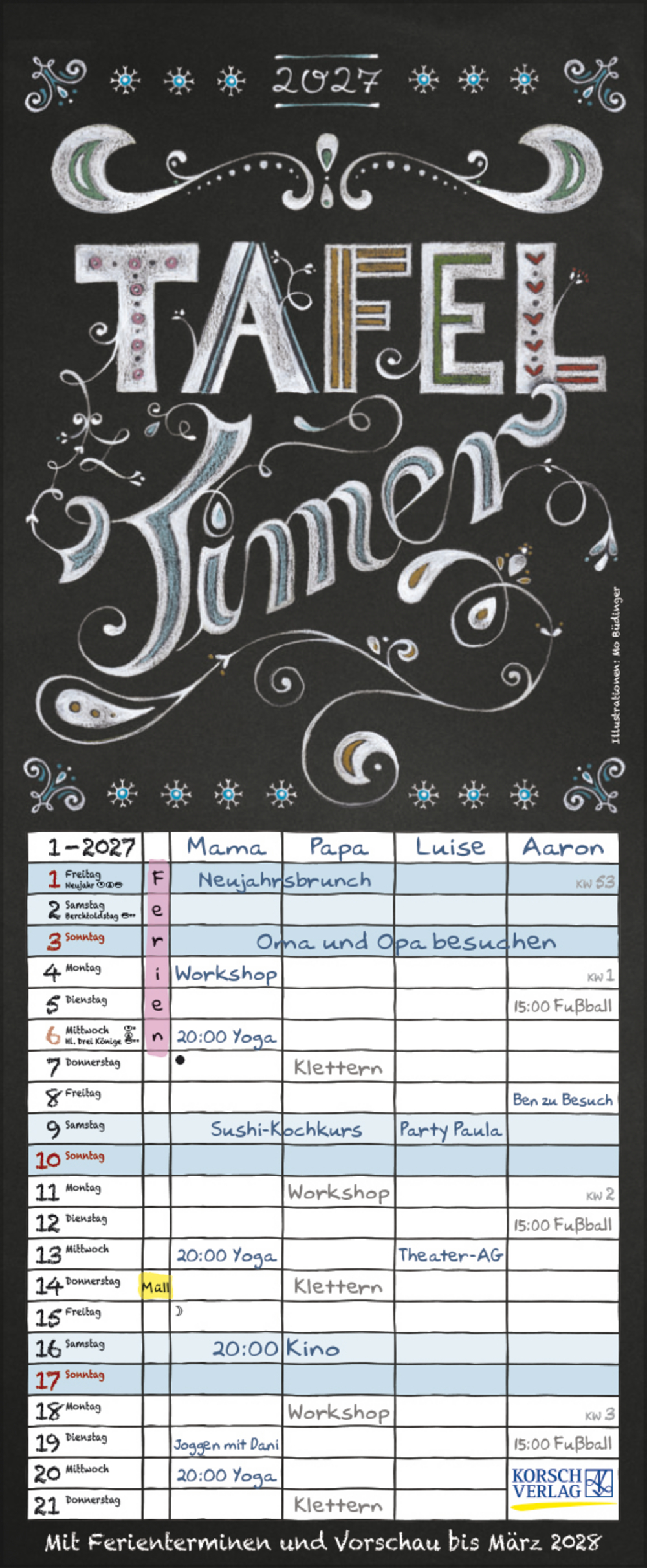 Dieser liebevoll von der Künstlerin Mo Büdinger gestaltete Familienplaner im megatrendigen Tafel-Kreide-Look ist der passende Kalender für Menschen, die das Besondere suchen und Wert auf hochwertige Gestaltung legen. Die Kunst aus Typografie, Handlettering und Kreide einzigartige Bilder in Kreidetafel-Optik im Caféhaus-Stil entstehen zu lassen. Von Hand gezeichnete Kreidestriche und schwungvolle Verzierungen lassen auf dem dunklen Tafelhintergrund Buchstaben und Bilder miteinander zu einem Kunstwerk verschmelzen und setzen jeden Monat gekonnt in Szene.