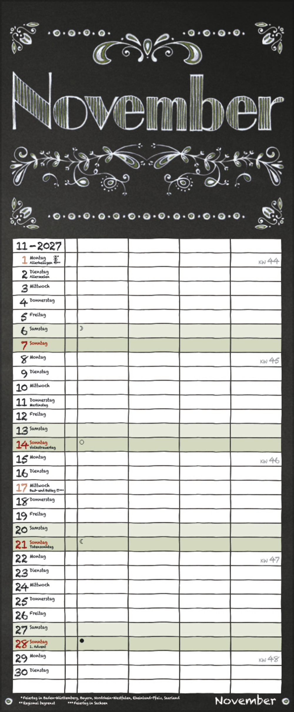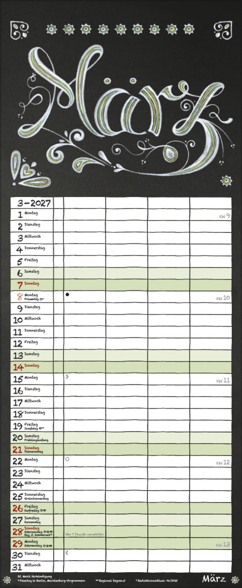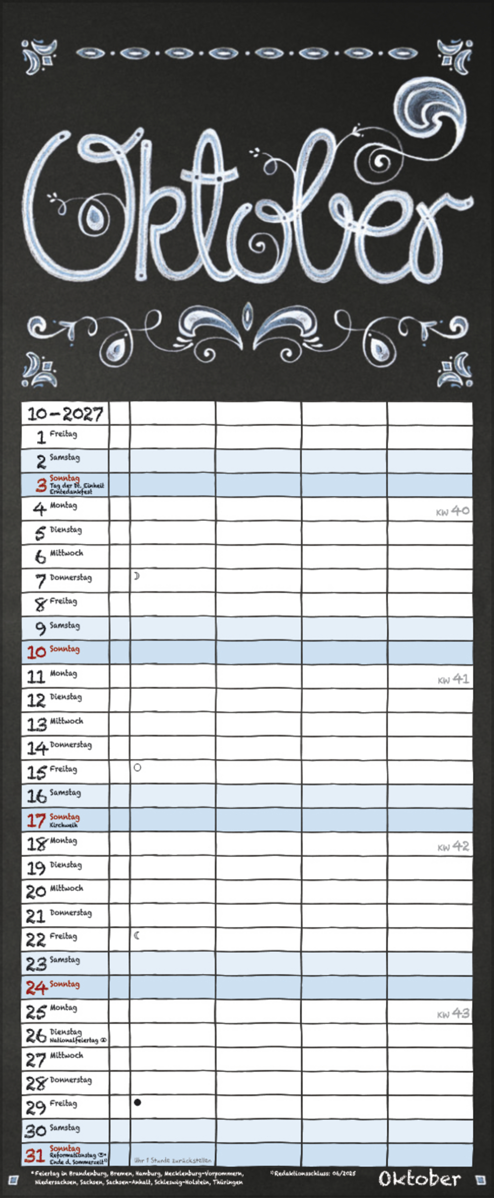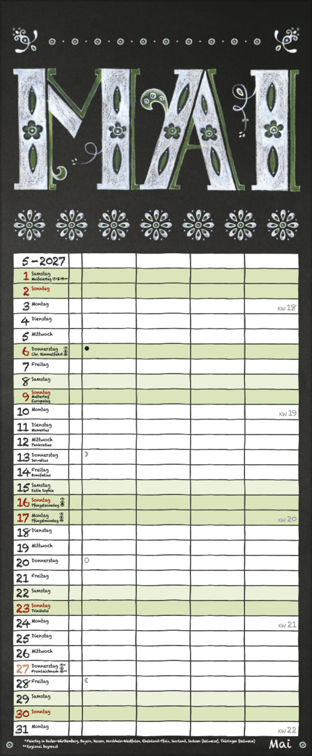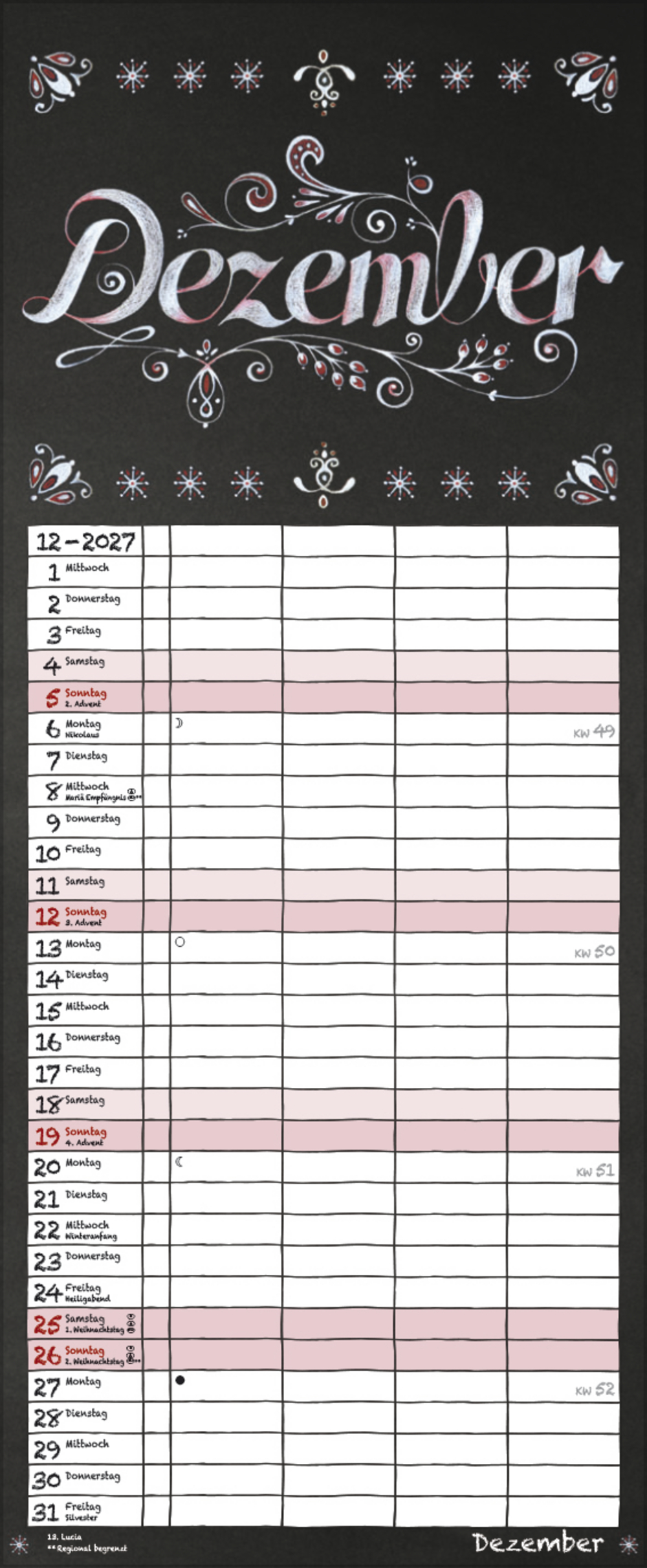 Weitere Informationen wie Mondphasen, Ferientermine und Feiertage (auch regionale) sowie deutlich lesbare Kalenderwochen runden den Kalender ab und sorgen für einen vollständigen Überblick Ihres Jahres.