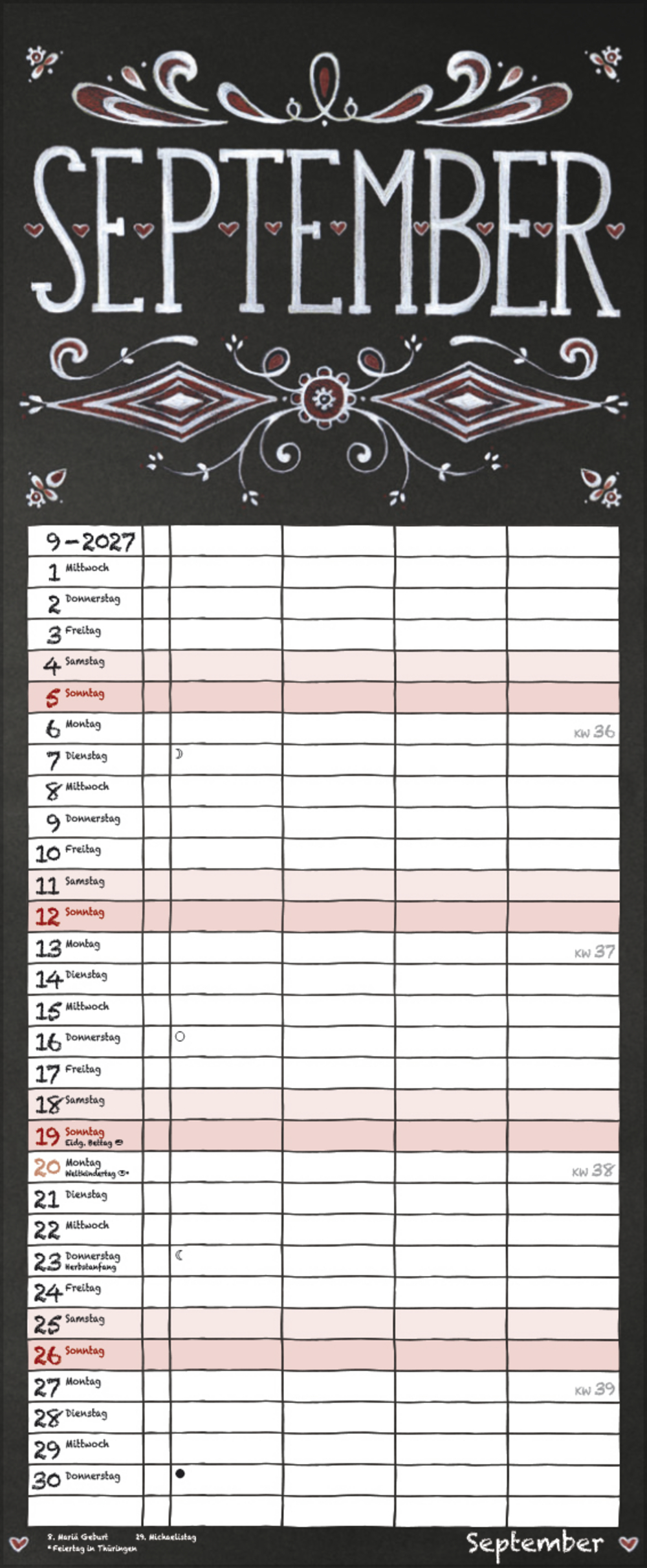 - Terminkalender mit viel Platz für Eintragungen, ohne störende Bilder in den Spalten