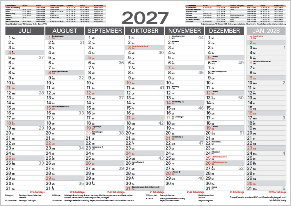 • Kalendarium auf Deutsch mit hervorgehobenen Sonn- und Feiertagen für D, A und CH