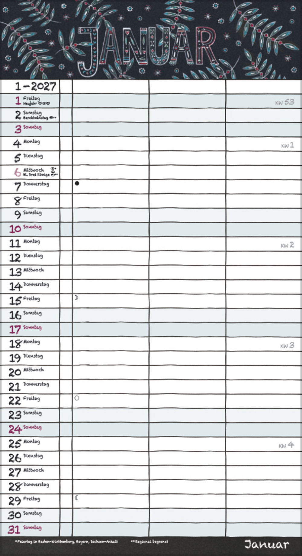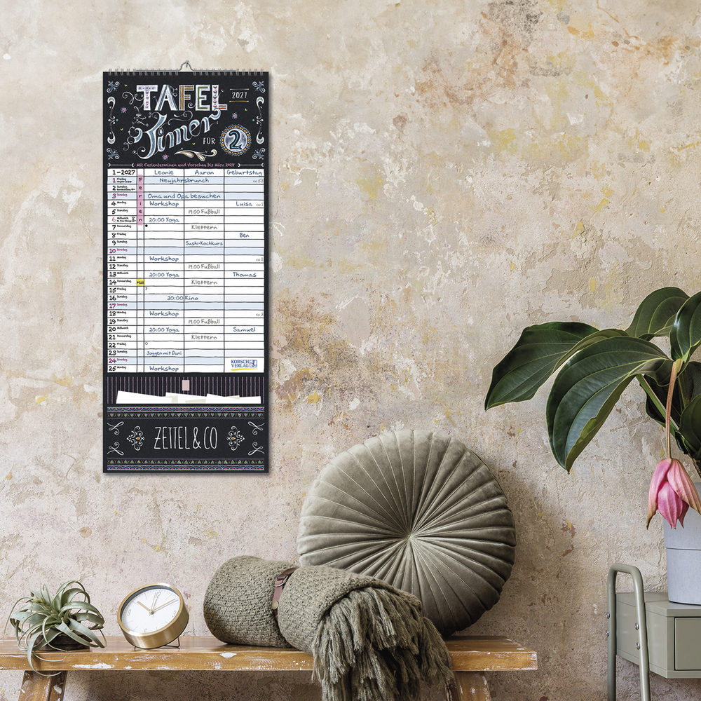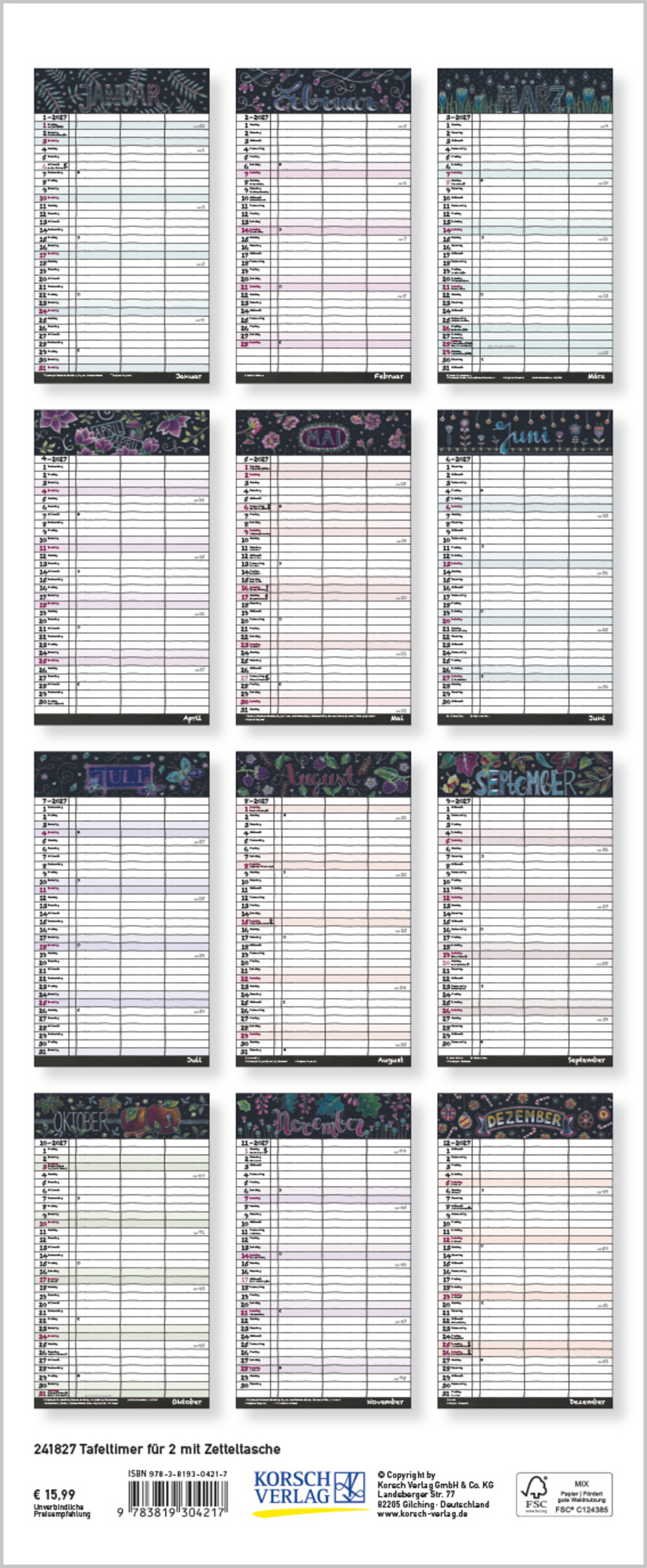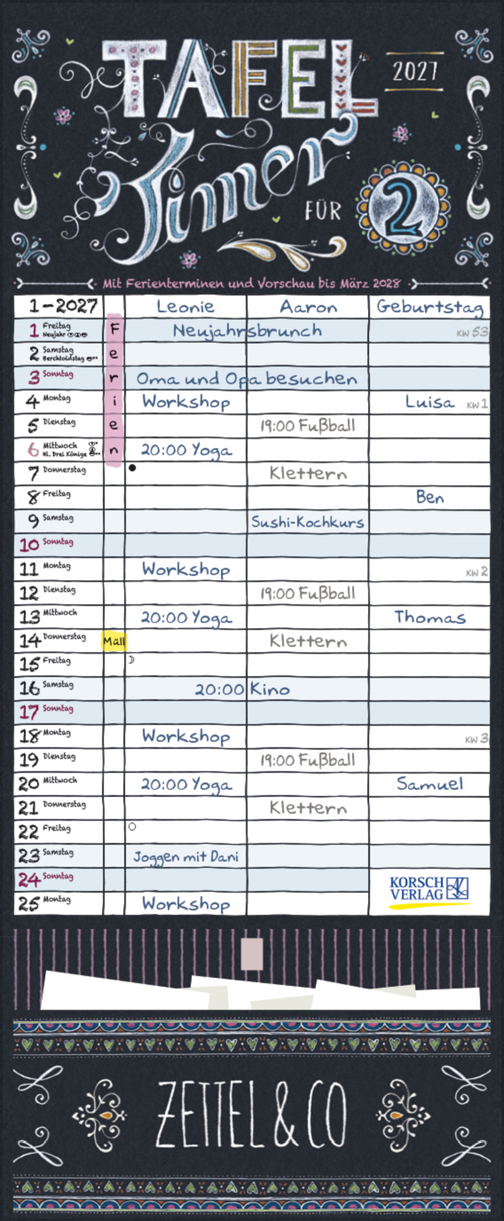 Dieser liebevoll von Mo Büdinger gestaltete Familienplaner im trendigen Tafel-Kreide-Look ist der passende Kalender für Menschen, die das Besondere suchen und Wert auf hochwertige Gestaltung legen. Für die perfekte Organisation sorgen 3 Spalten plus Müllspalte sowie Ferientermine und eine Vorschau bis März des Folgejahres. Praktisch ausgestattet ist er zudem mit Stifthalter und wundersch öner Zetteltasche.