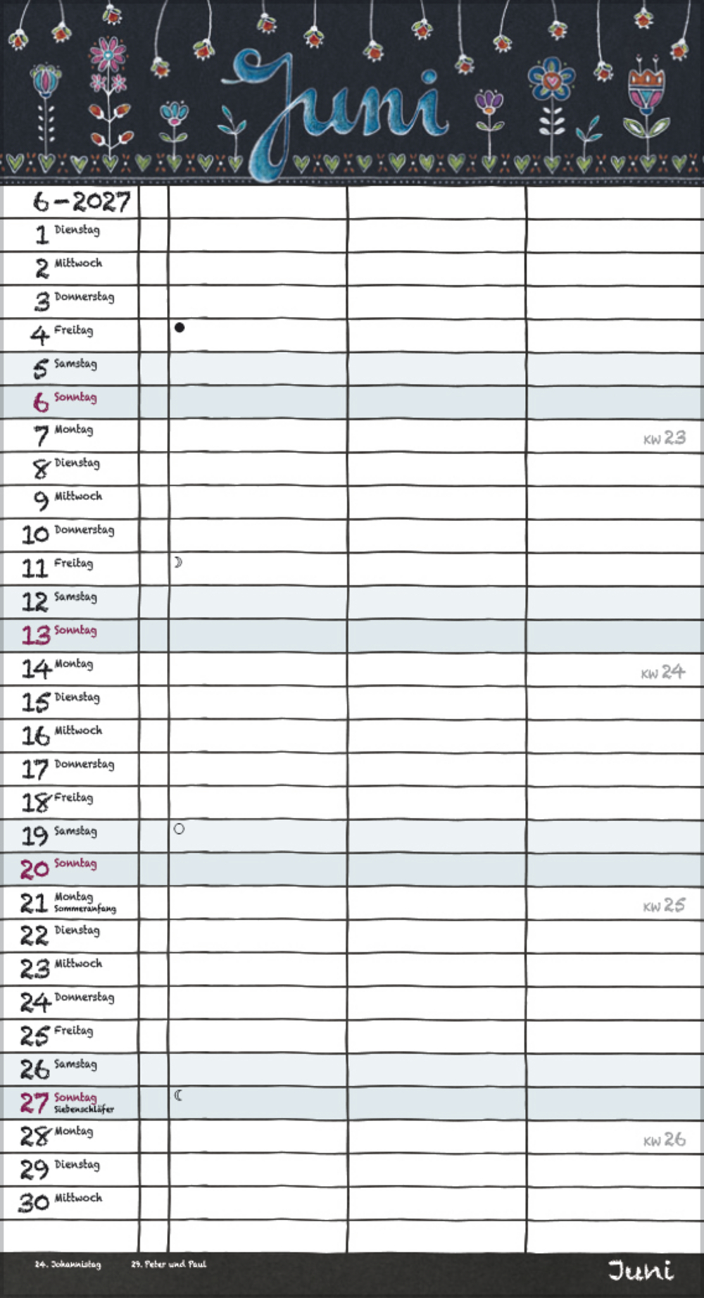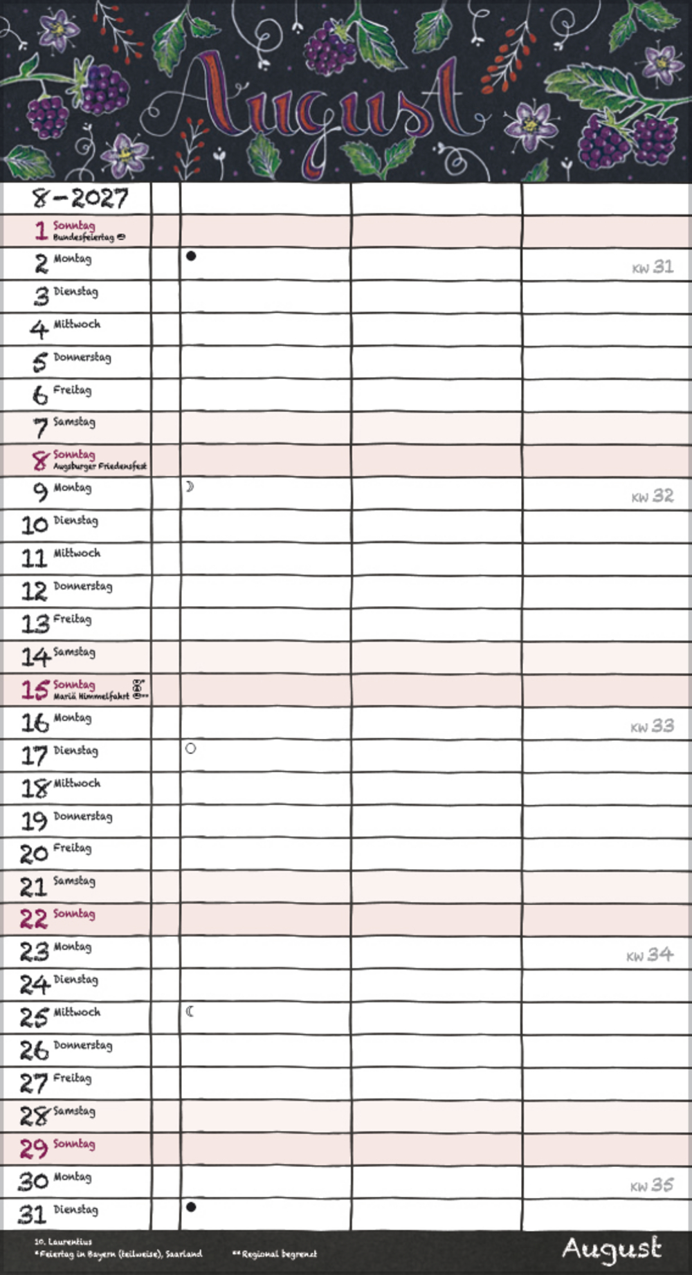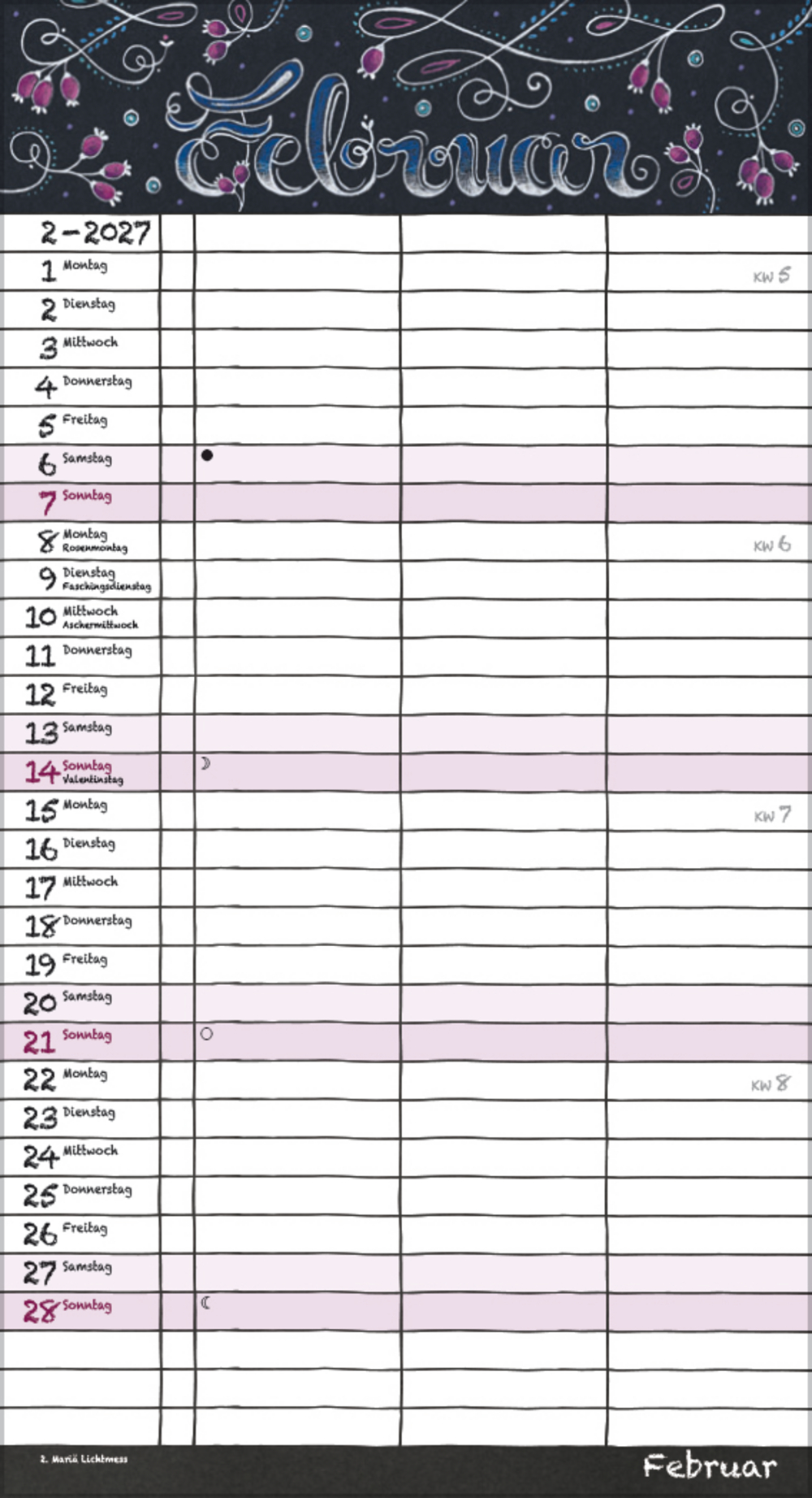 Dieser liebevoll von Mo Büdinger gestaltete Familienplaner im trendigen Tafel-Kreide-Look ist der passende Kalender für Menschen, die das Besondere suchen und Wert auf hochwertige Gestaltung legen. Für die perfekte Organisation sorgen 3 Spalten plus Müllspalte sowie Ferientermine und eine Vorschau bis März des Folgejahres. Praktisch ausgestattet ist er zudem mit Stifthalter und wundersch öner Zetteltasche.