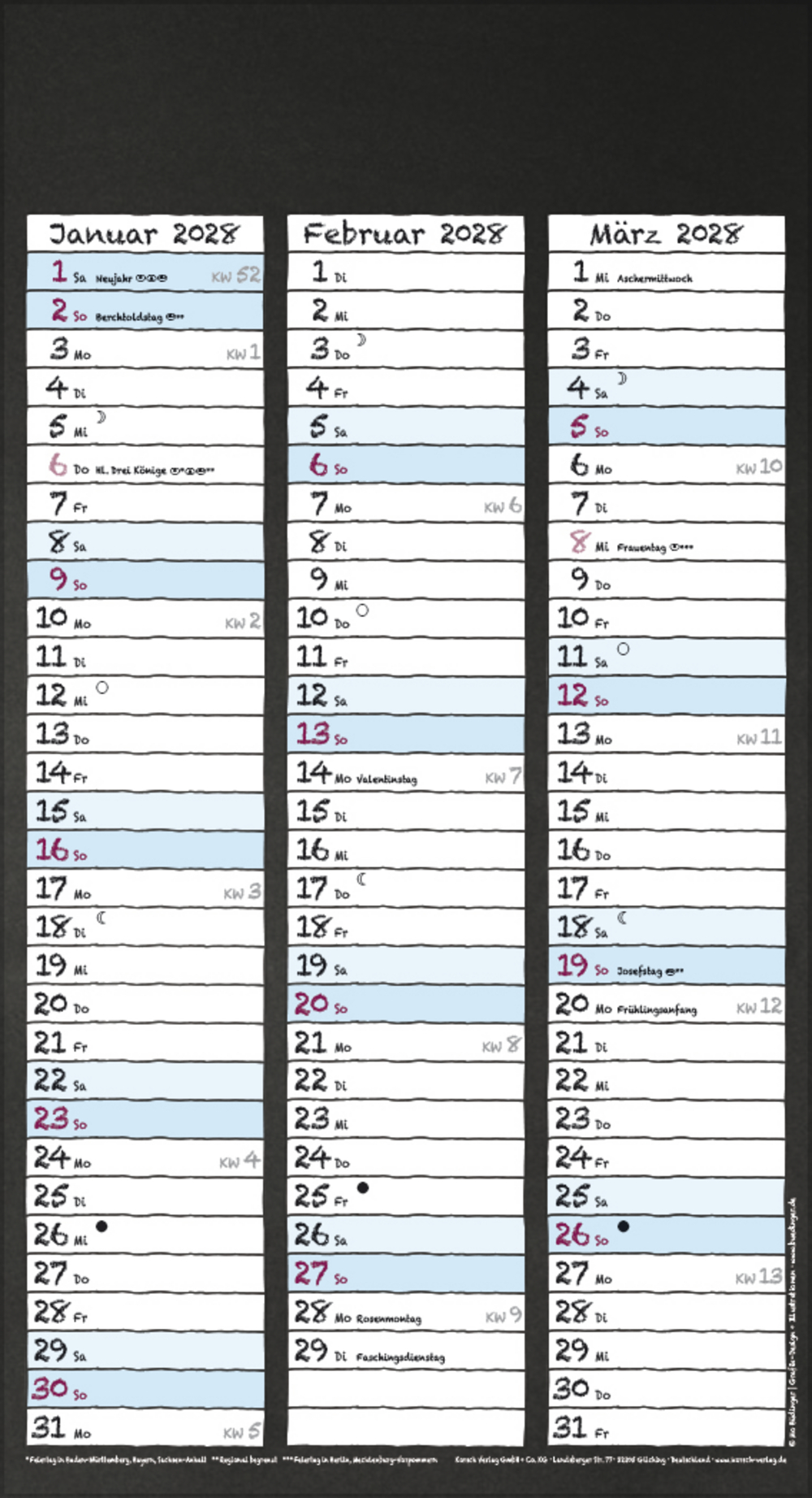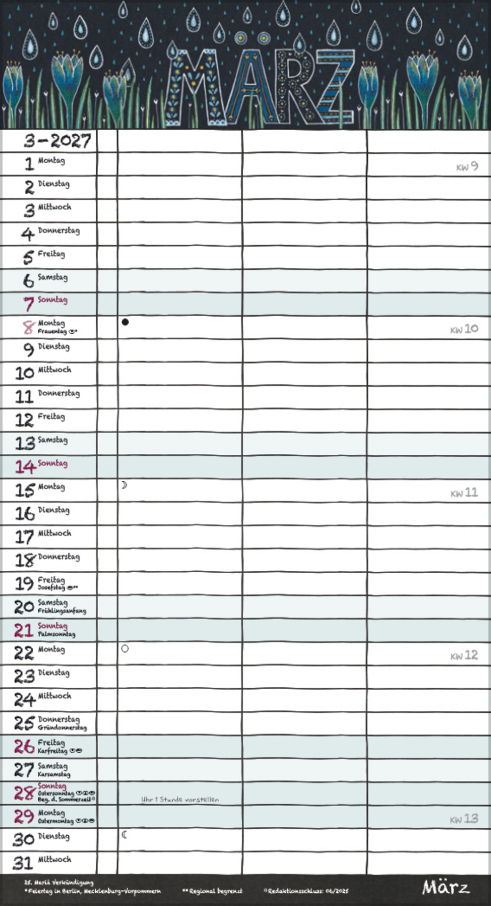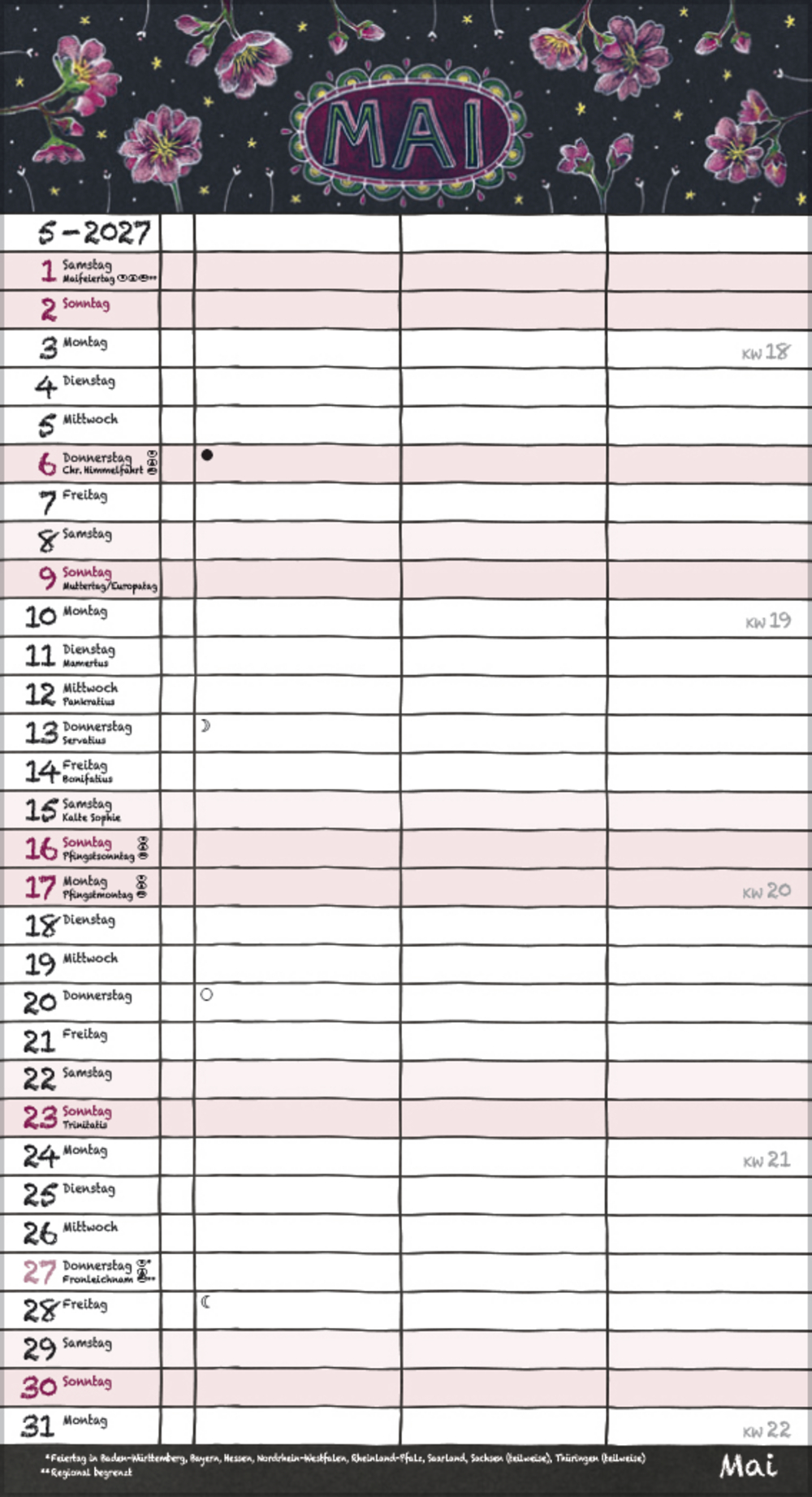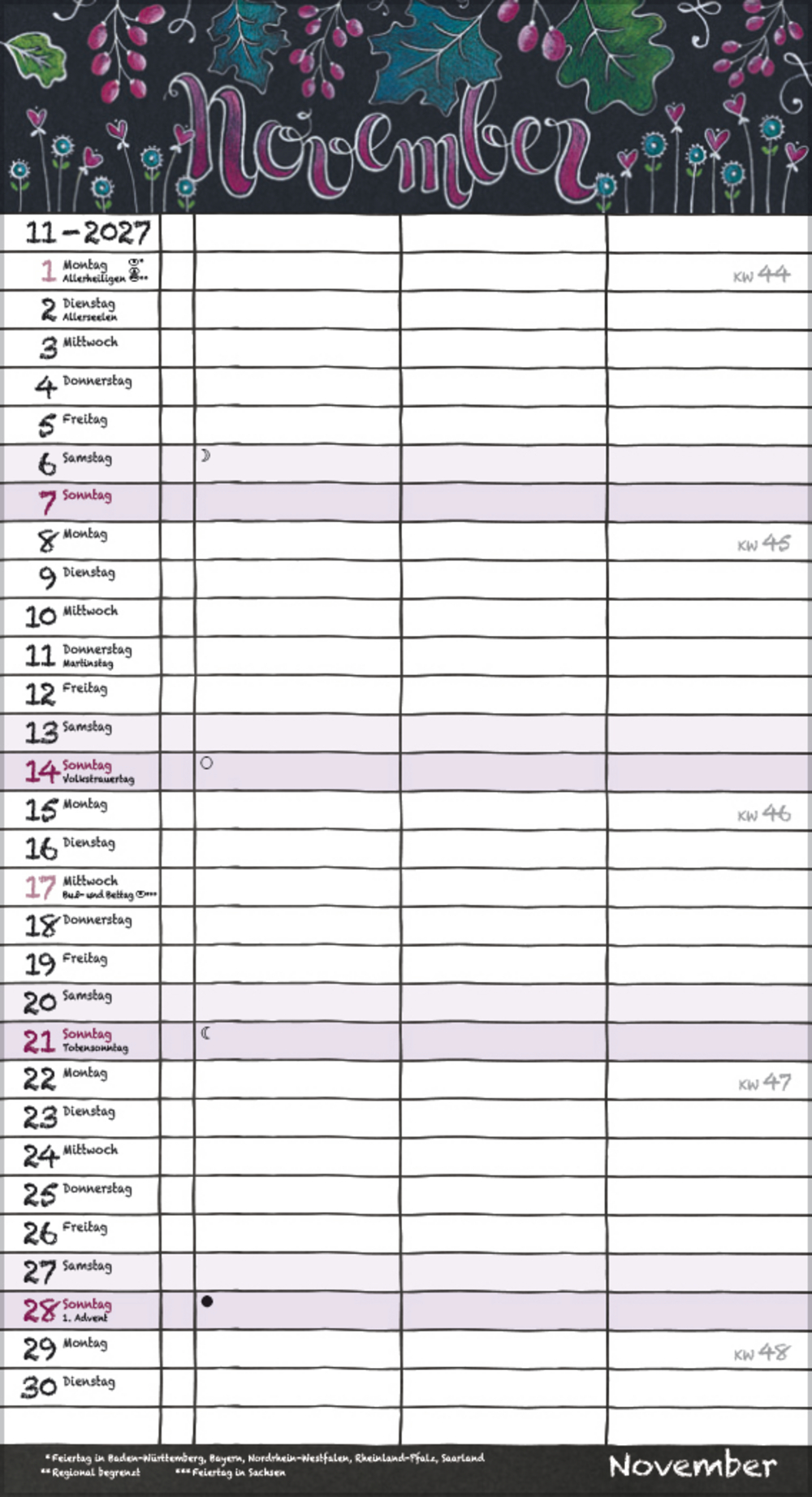 Dieser liebevoll von Mo Büdinger gestaltete Familienplaner im trendigen Tafel-Kreide-Look ist der passende Kalender für Menschen, die das Besondere suchen und Wert auf hochwertige Gestaltung legen. Für die perfekte Organisation sorgen 3 Spalten plus Müllspalte sowie Ferientermine und eine Vorschau bis März des Folgejahres. Praktisch ausgestattet ist er zudem mit Stifthalter und wundersch öner Zetteltasche.