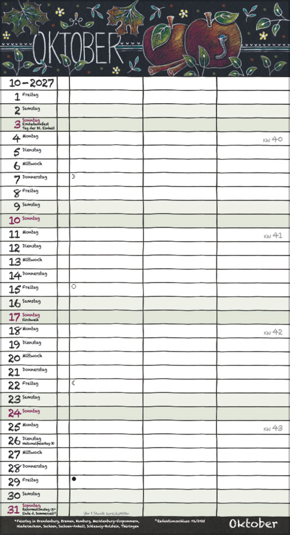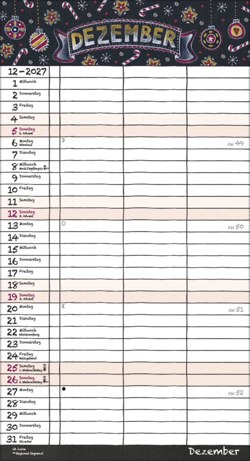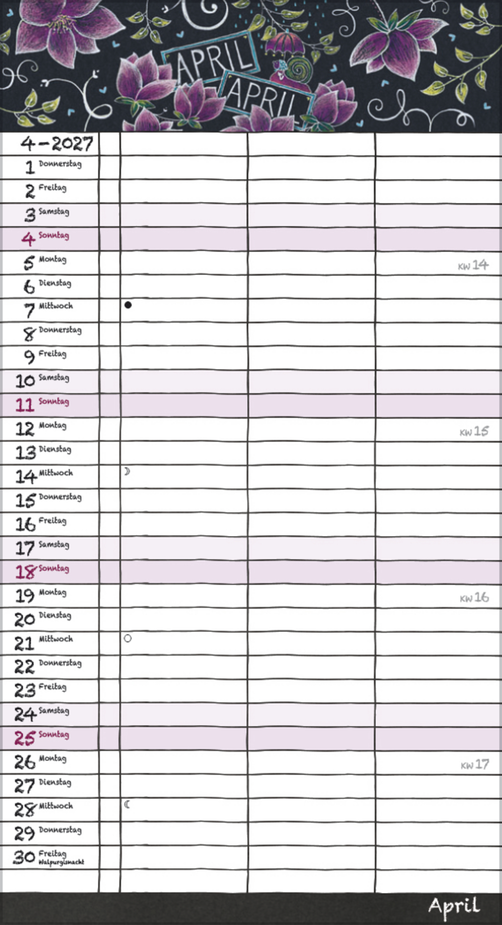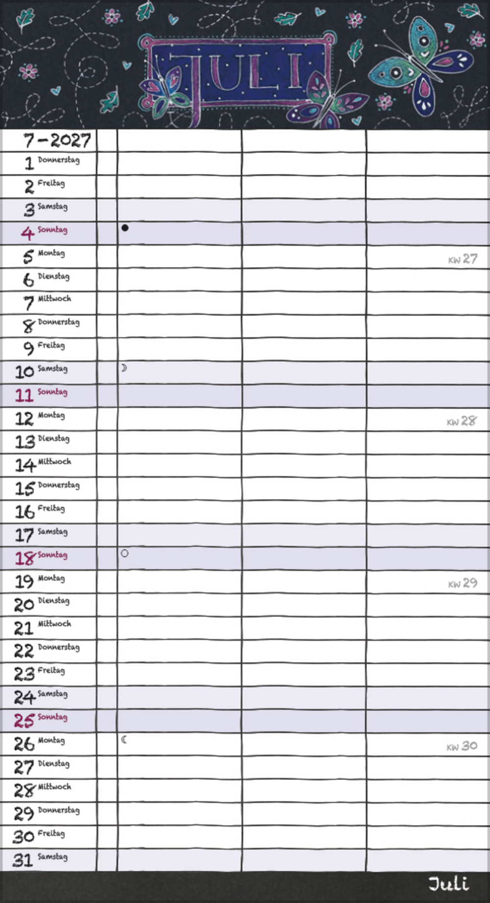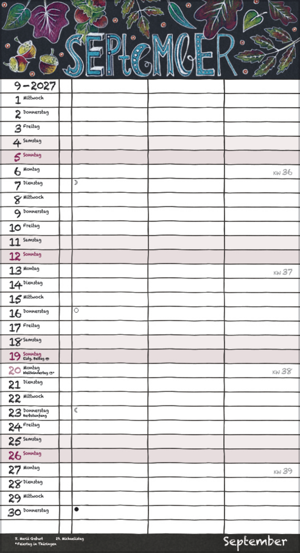 - Viel Platz für Eintragungen, ohne störende Bilder in den Spalten