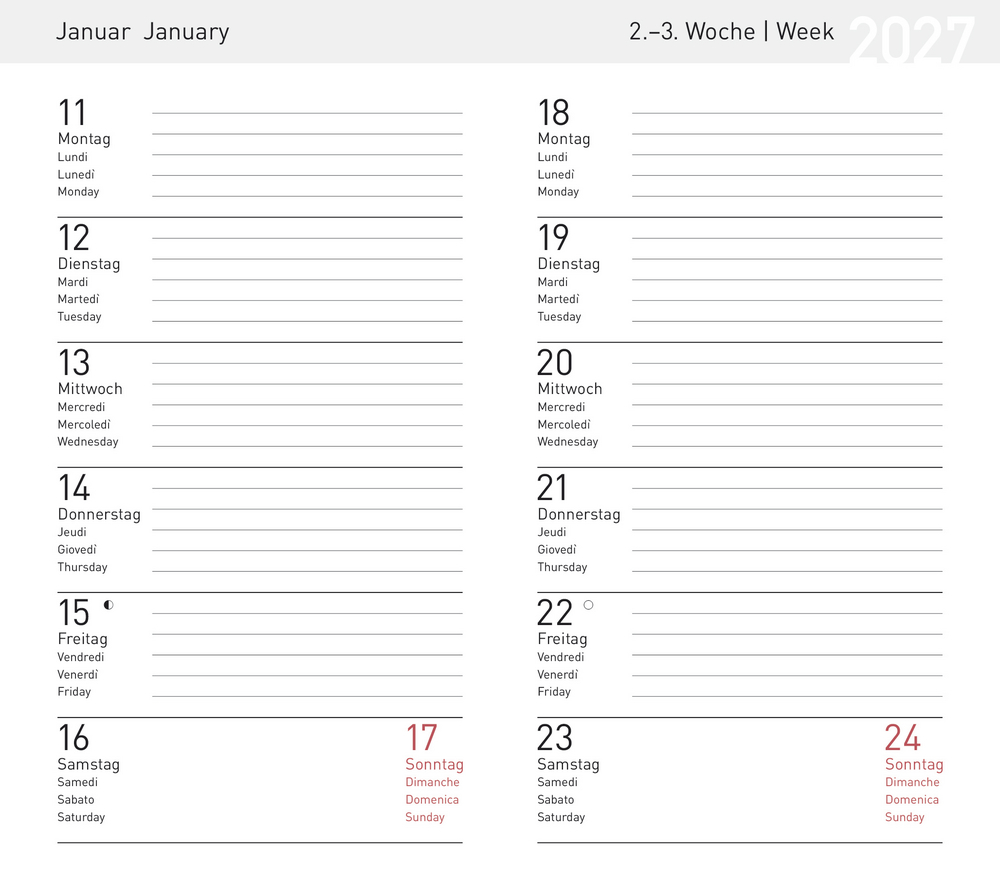 • Jede Kalenderwoche übersichtlich auf einer Seite; Anzeige der Mondphasen