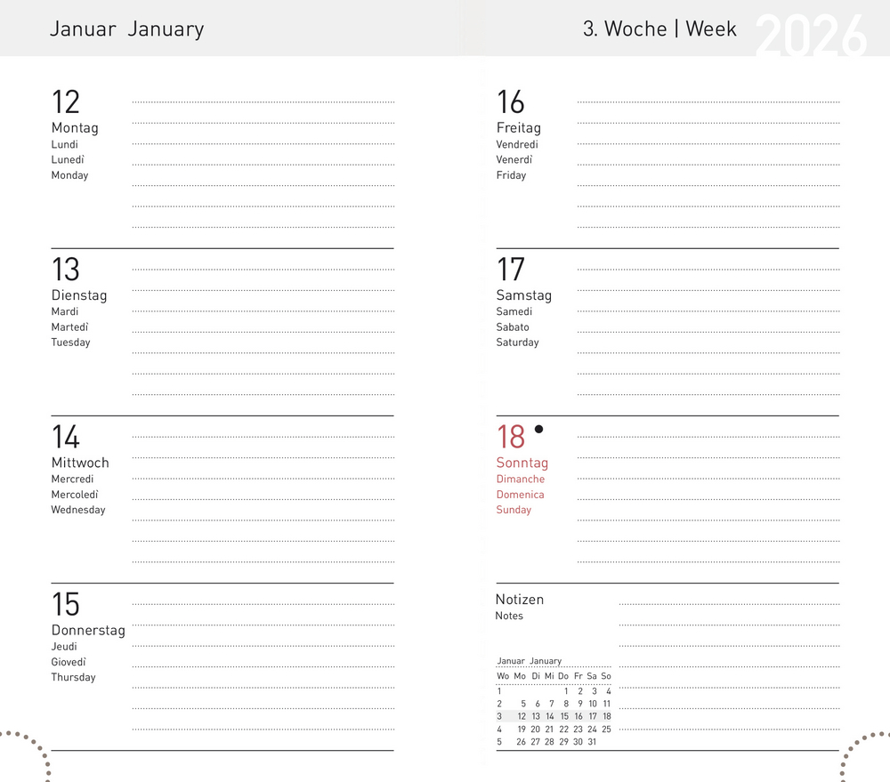 - Praktische Monatsübersicht auf jeder Doppelseite mit Kalenderwochen