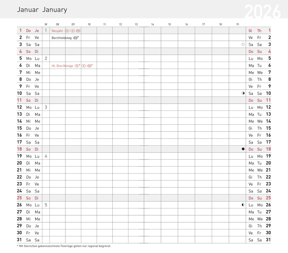 - Jeden Monat übersichtlich auf einer Doppelseite; Inklusive Uhrzeiten und Anzeige der Mondphasen