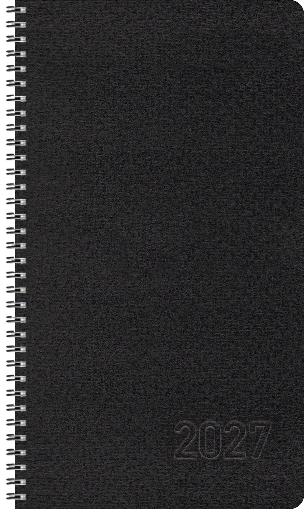 Moderner Taschenkalender mit schwarzem Einband. Umschlag aus edlem Strukturpapier. Pro Woche 1 Doppelseite. Kalendarium d-e-f-i.