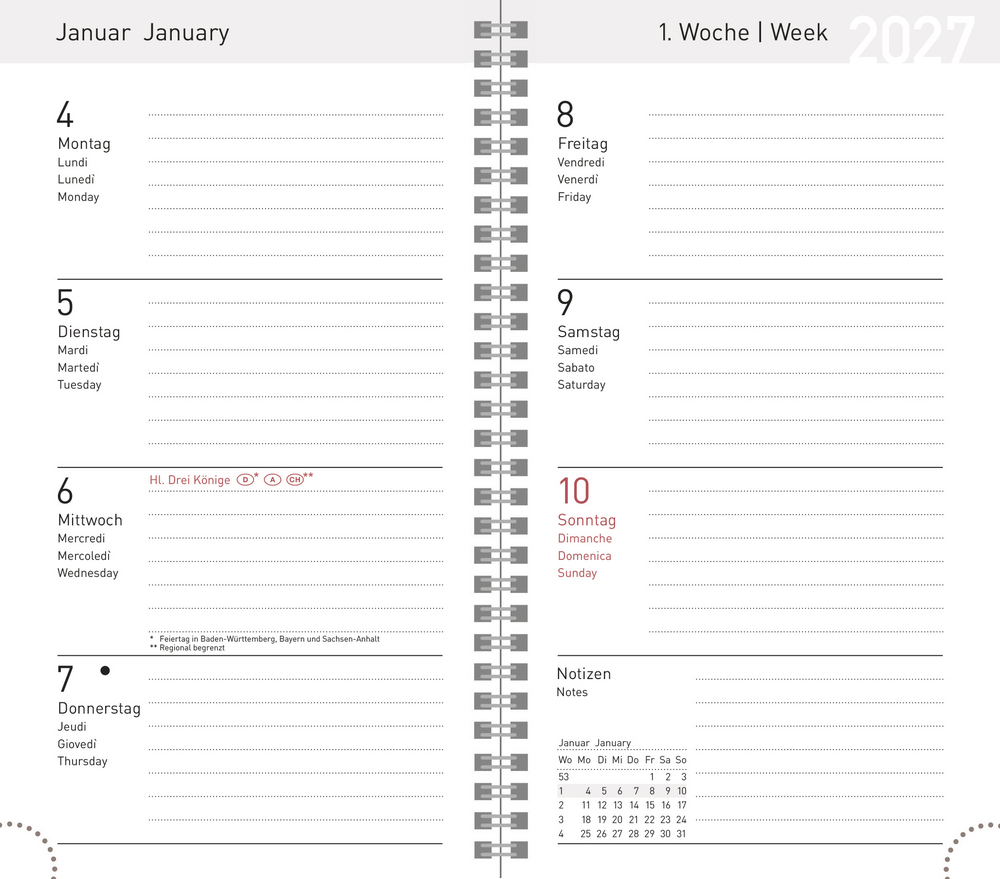 - Jede Kalenderwoche übersichtlich auf einer Doppelseite