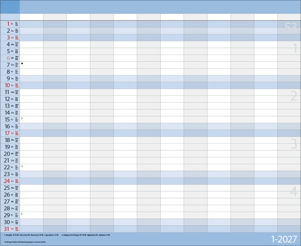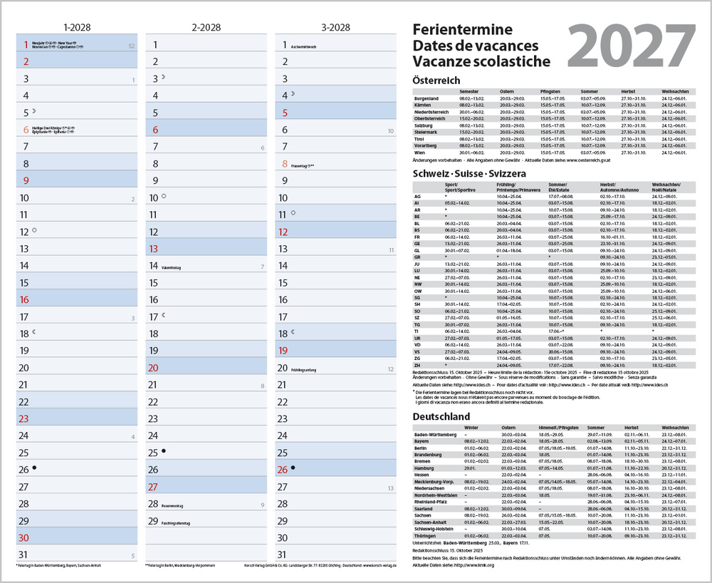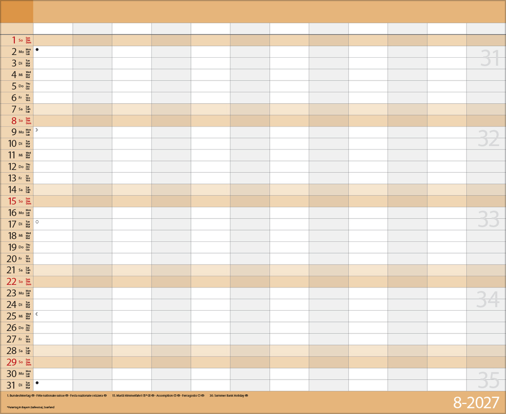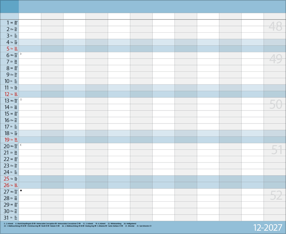 • Kalendarium auf Deutsch, Englisch, Franz ösisch und Italienisch mit hervorgehobenen Sonn- und Feiertagen für D, A und CH, mit Spalte für Namen, Projekten usw.