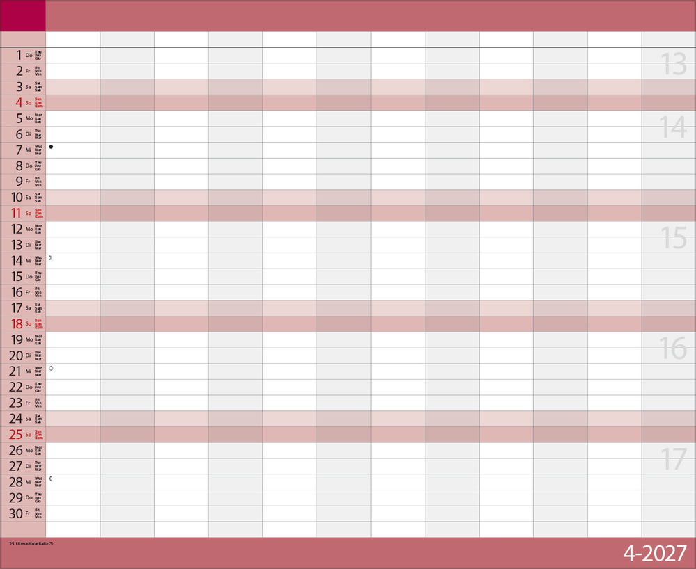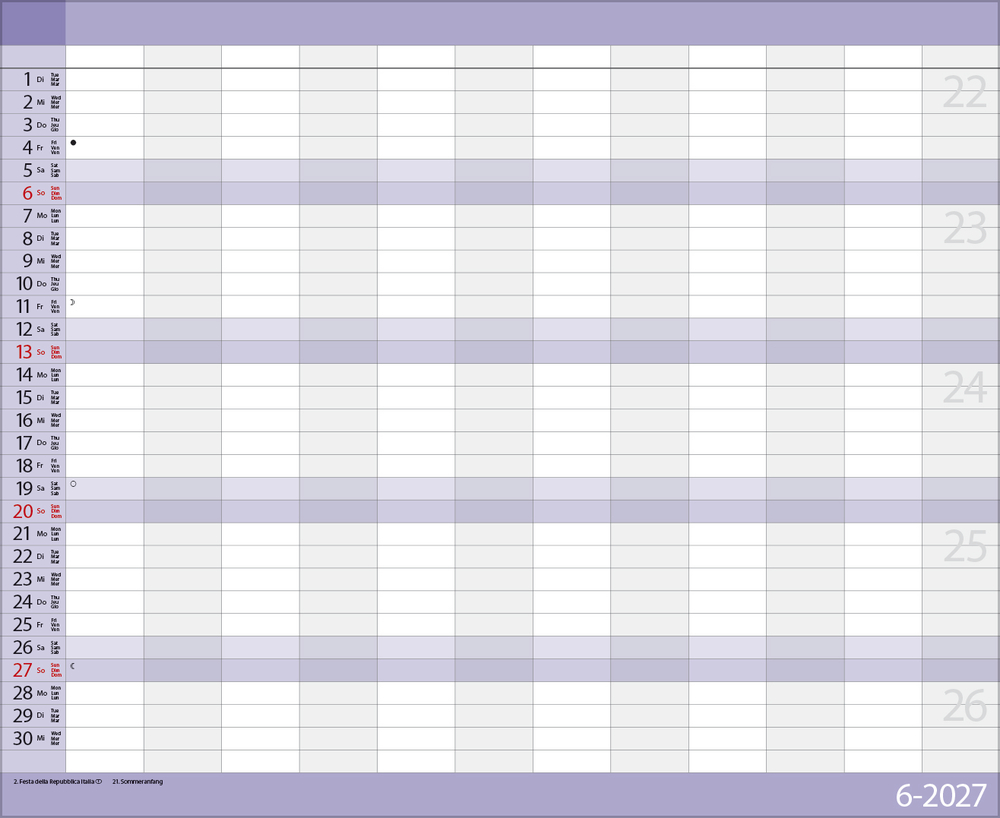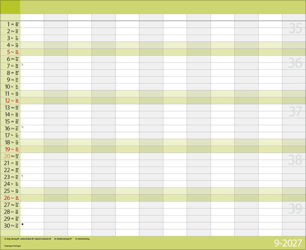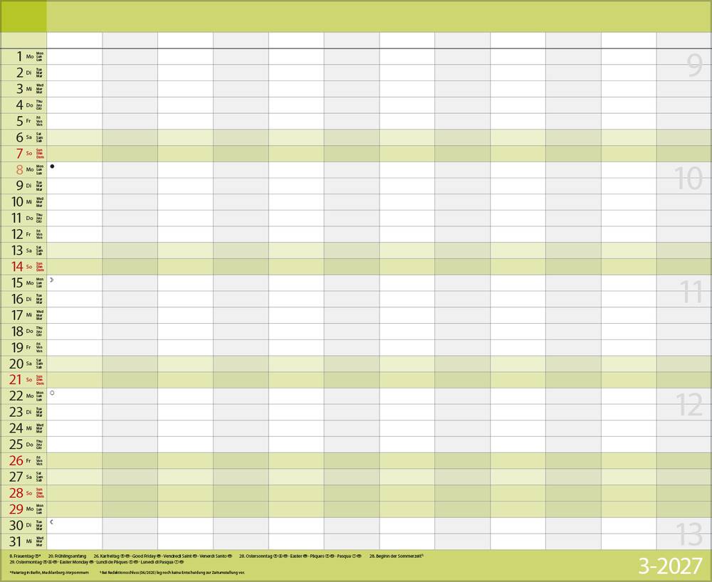 • Kalendarium auf Deutsch, Englisch, Franz ösisch und Italienisch mit hervorgehobenen Sonn- und Feiertagen für D, A und CH, mit Spalte für Namen, Projekten usw.