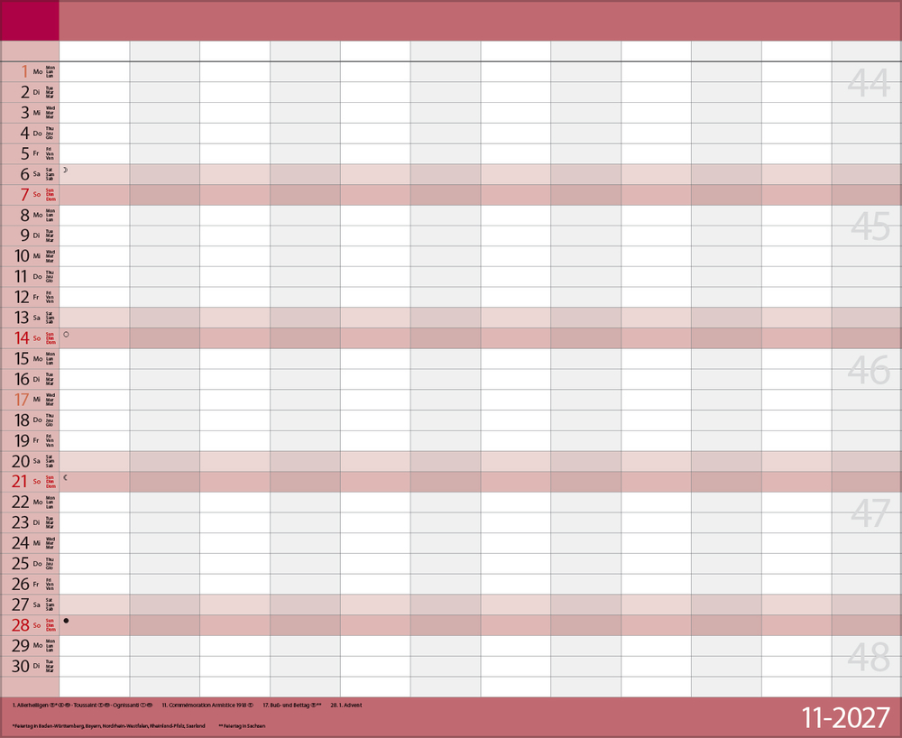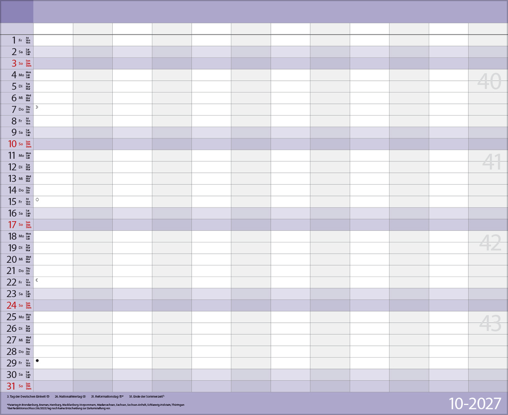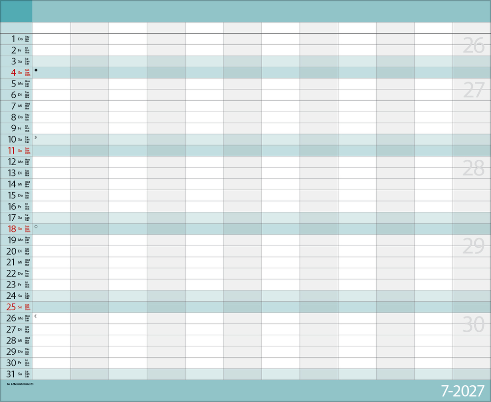 Praktischer Teamplaner mit 12 Spalten. Ideal zum Planen von Terminen, Urlaub, Aufgaben, Projekten und viel mehr! Mit Ferienterminen und Vorschau bis März des Folgejahres. Kalendarium d-e-f-i.