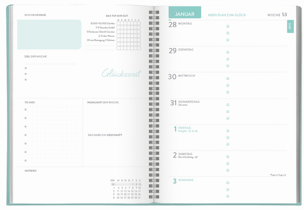 Dein Kalender für mehr Lebensfreude und Erfüllung. Woche für Woche hältst du kleine und große Glücksmomente fest und schaffst Raum für mehr Freude und Dankbarkeit in deinem Alltag. Dein Kalender begleitet dich das ganze Jahr auf diesem Weg – zu einem erfüllten und glücklichen Leben!