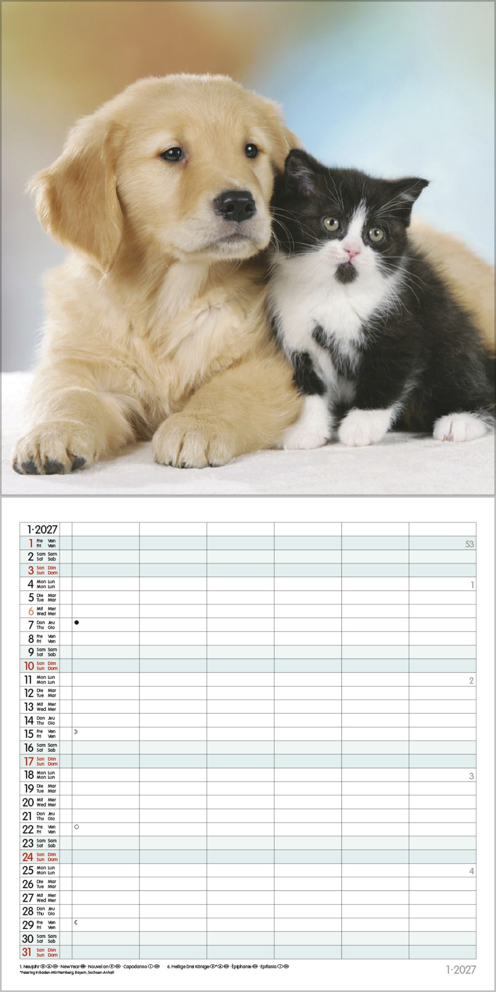 - Jede Kalenderseite mit großem Bild und viel Platz im Kalendarium für Notizen und Termine
