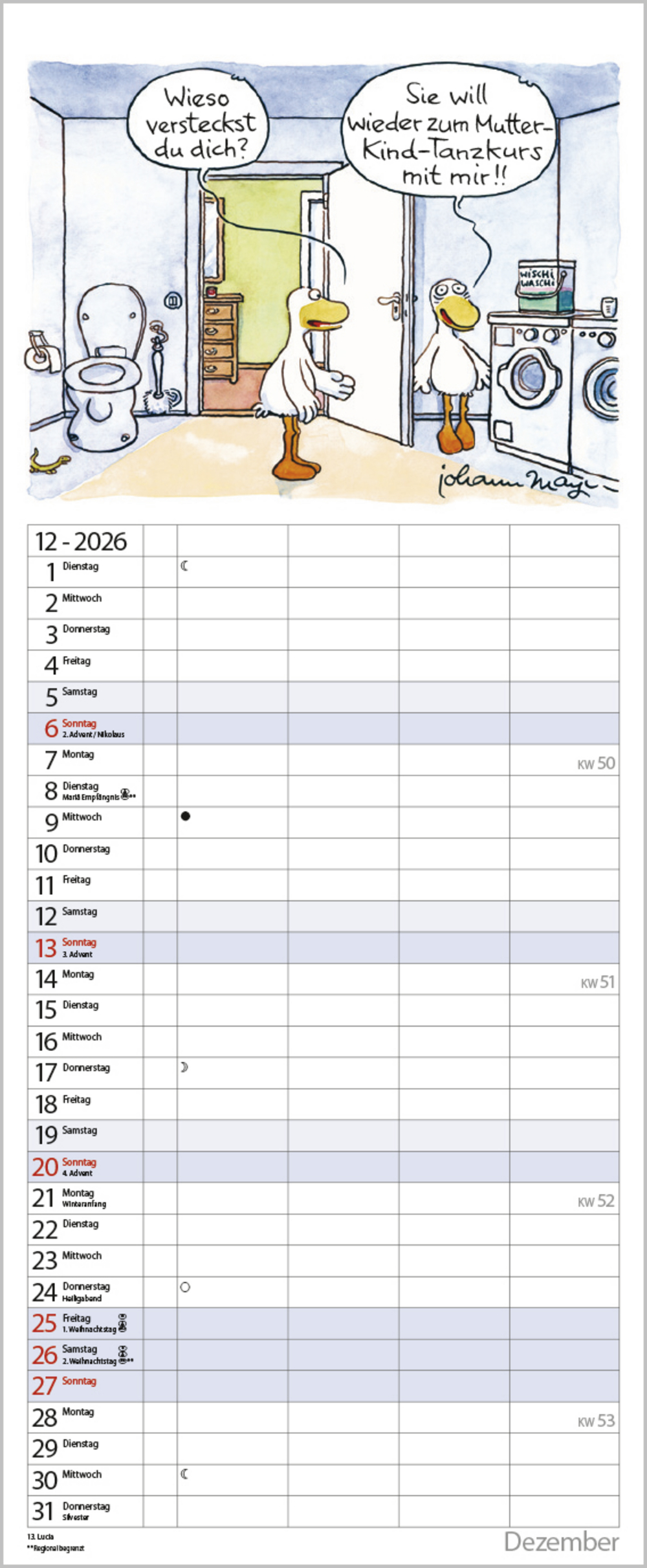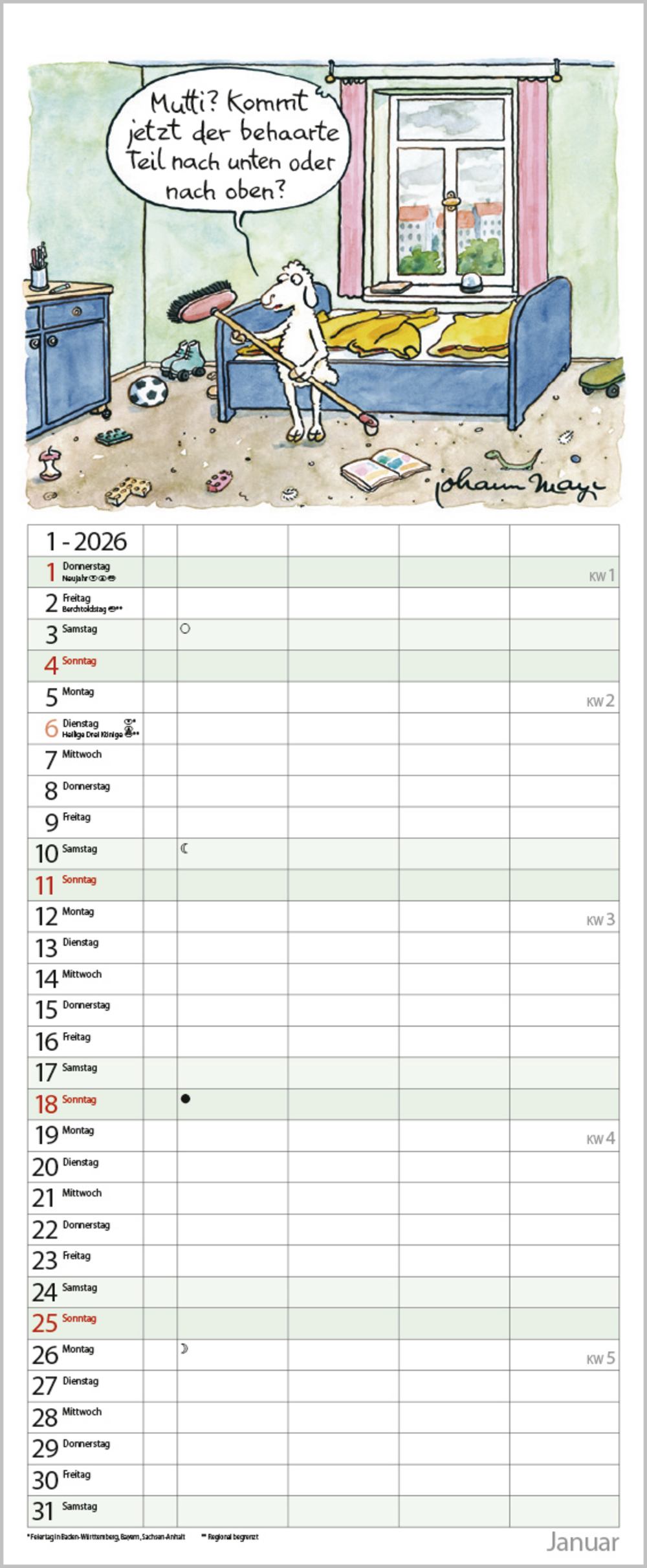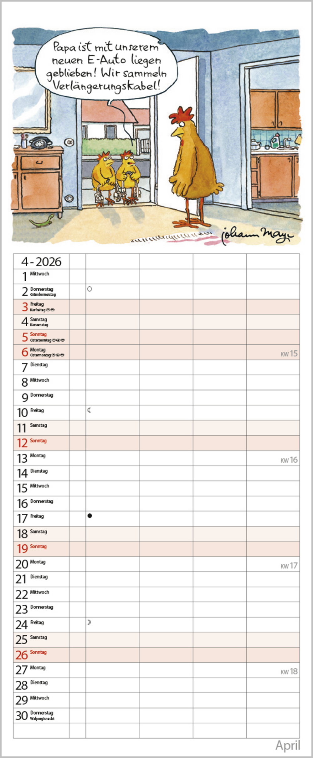 Praktischer Timer mit 4 Spalten und witzigen Familiencartoons von Johann Mayr. Neben dem gesamten Kalenderjahr enthält der Wandplaner auch eine Vorschau bis März des Folgejahres.