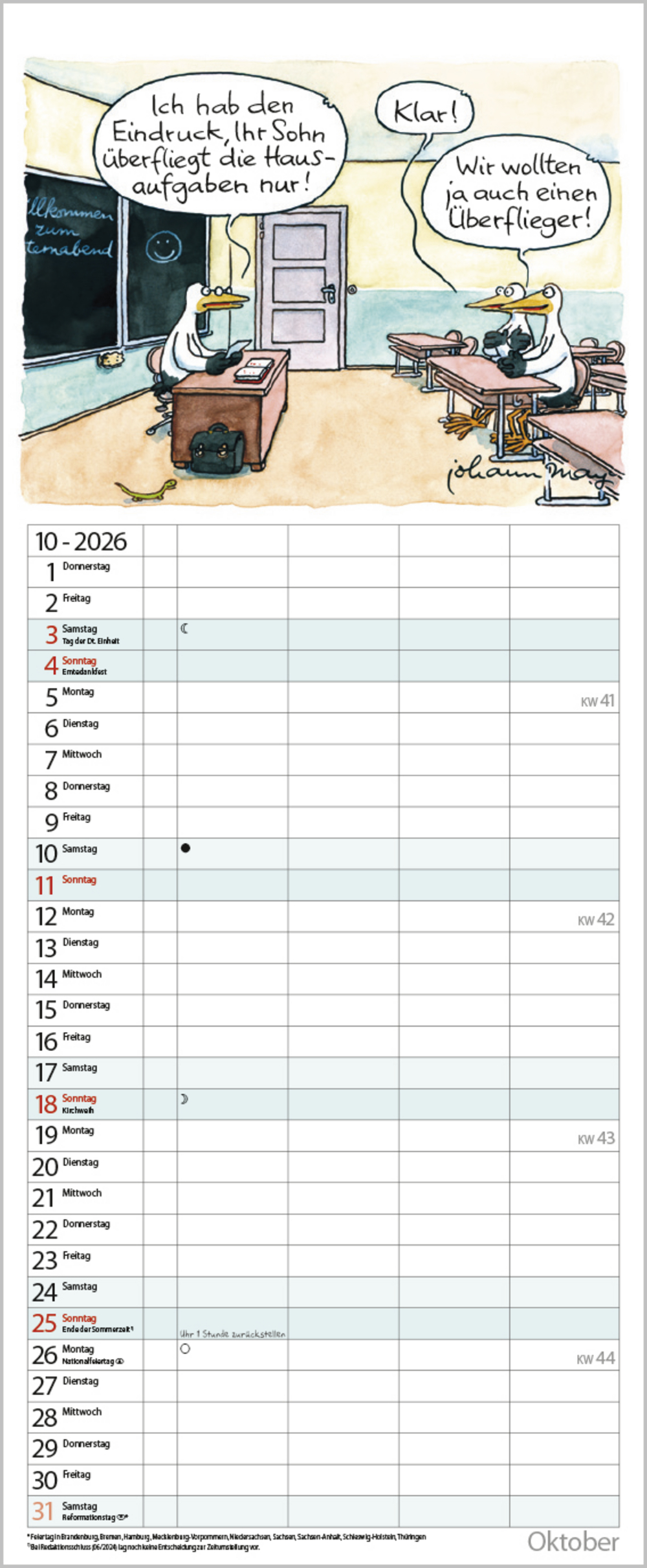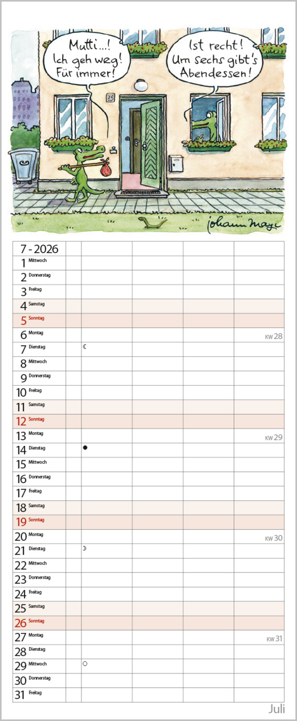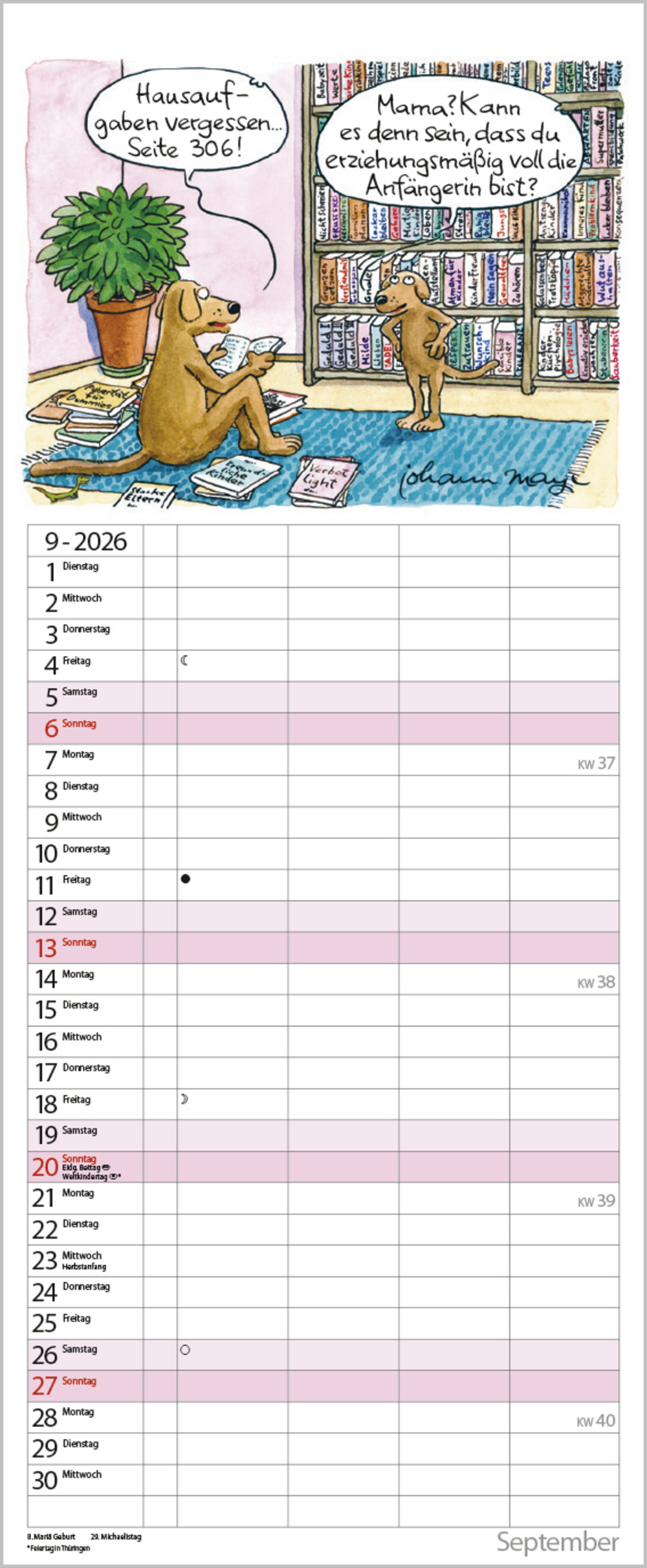 Praktischer Timer mit 4 Spalten und witzigen Familiencartoons von Johann Mayr. Neben dem gesamten Kalenderjahr enthält der Wandplaner auch eine Vorschau bis März des Folgejahres.